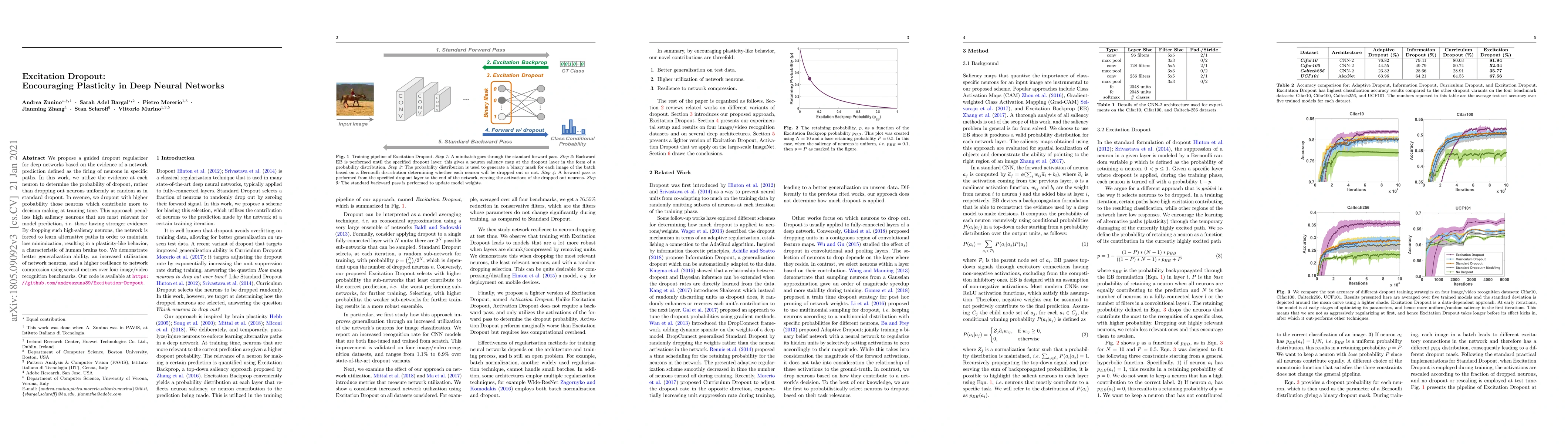 We propose a guided dropout regularizer for deep networks based on the evidence of a network prediction defined as the firing of neurons in specific paths. In this work, we utilize the evidence at each neuron to determine the probability of dropout, rather than dropping out neurons uniformly at random as in standard dropout. In essence, we dropout with higher probability those neurons which contribute more to decision making at training time. This approach penalizes high saliency neurons that are most relevant for model prediction, i.e. those having stronger evidence. By dropping such high-saliency neurons, the network is forced to learn alternative paths in order to maintain loss minimization, resulting in a plasticity-like behavior, a characteristic of human brains too. We demonstrate better generalization ability, an increased utilization of network neurons, and a higher resilience to network compression using several metrics over four image/video recognition benchmarks.