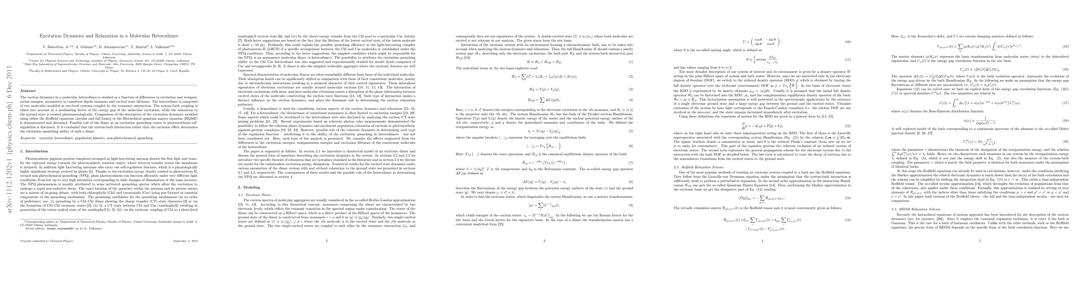 This research investigates exciton dynamics in molecular heterodimers, finding that system-bath interaction, not excitonic effects, primarily causes excitation quenching. It compares Redfield equations and Hierarchical Quantum Master Equation models, suggesting the dimer's potential role in photosynthesis self-regulation.