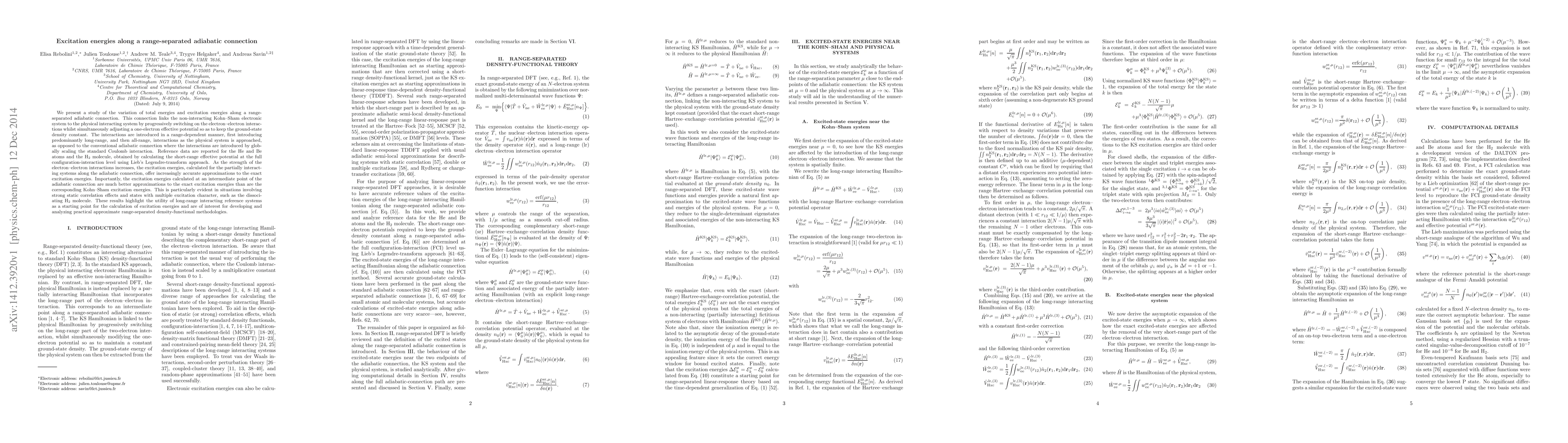 We present a study of the variation of total energies and excitationenergies along a range-separated adiabatic connection. This connectionlinks the non-interacting Kohn-Sham electronic system to the physicalinteracting system by progressively switching on theelectron-electron interactions whilst simultaneously adjusting aone-electron effective potential so as to keep the ground-statedensity constant. The interactions are introduced in arange-dependent manner, first introducing predominantly long-range,and then all-range, interactions as the physical system is approached,as opposed to the conventional adiabatic connection where theinteractions are introduced by globally scaling the standard Coulomb interaction.Reference data are reported for the He and Be atoms and the H2molecule, obtained by calculating the short-range effective potentialat the full configuration-interaction level using Lieb'sLegendre-transform approach. As the strength of the electron-electroninteractions increases, the excitation energies, calculated for thepartially interacting systems along the adiabatic connection, offerincreasingly accurate approximations to the exact excitation energies.Importantly, the excitation energies calculated at an intermediatepoint of the adiabatic connection are much better approximations tothe exact excitation energies than are the corresponding Kohn-Shamexcitation energies. This is particularly evident in situationsinvolving strong static correlation effects and states with multipleexcitation character, such as the dissociating H2 molecule. Theseresults highlight the utility of long-range interacting referencesystems as a starting point for the calculation of excitation energiesand are of interest for developing and analyzing practical approximaterange-separated density-functional methodologies.