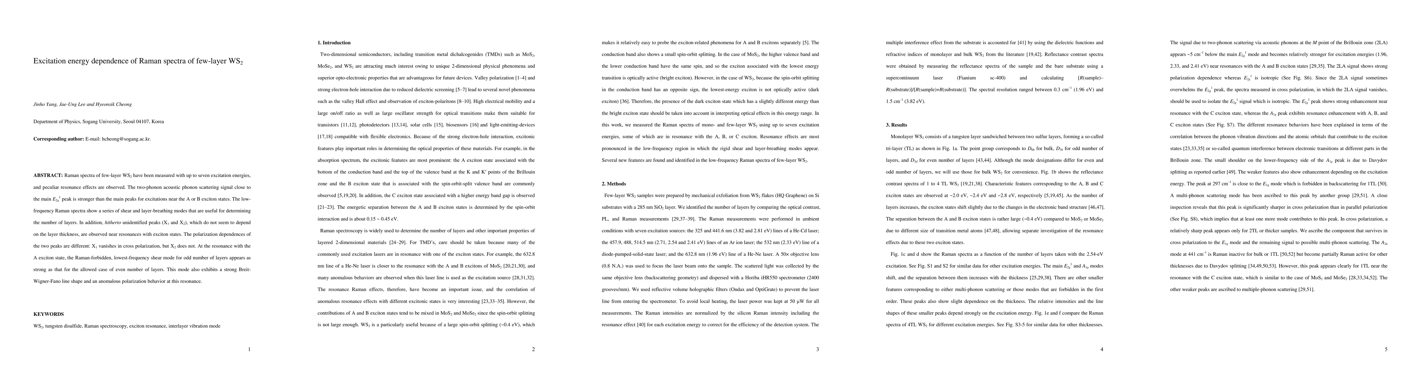 This paper investigates Raman spectra of few-layer WS2 across various excitation energies, revealing resonance effects and enhanced two-phonon acoustic phonon scattering near exciton states. It identifies unidentified peaks X1 and X2 with distinct polarization behaviors, and observes anomalous Raman-forbidden shear modes at A exciton resonance.