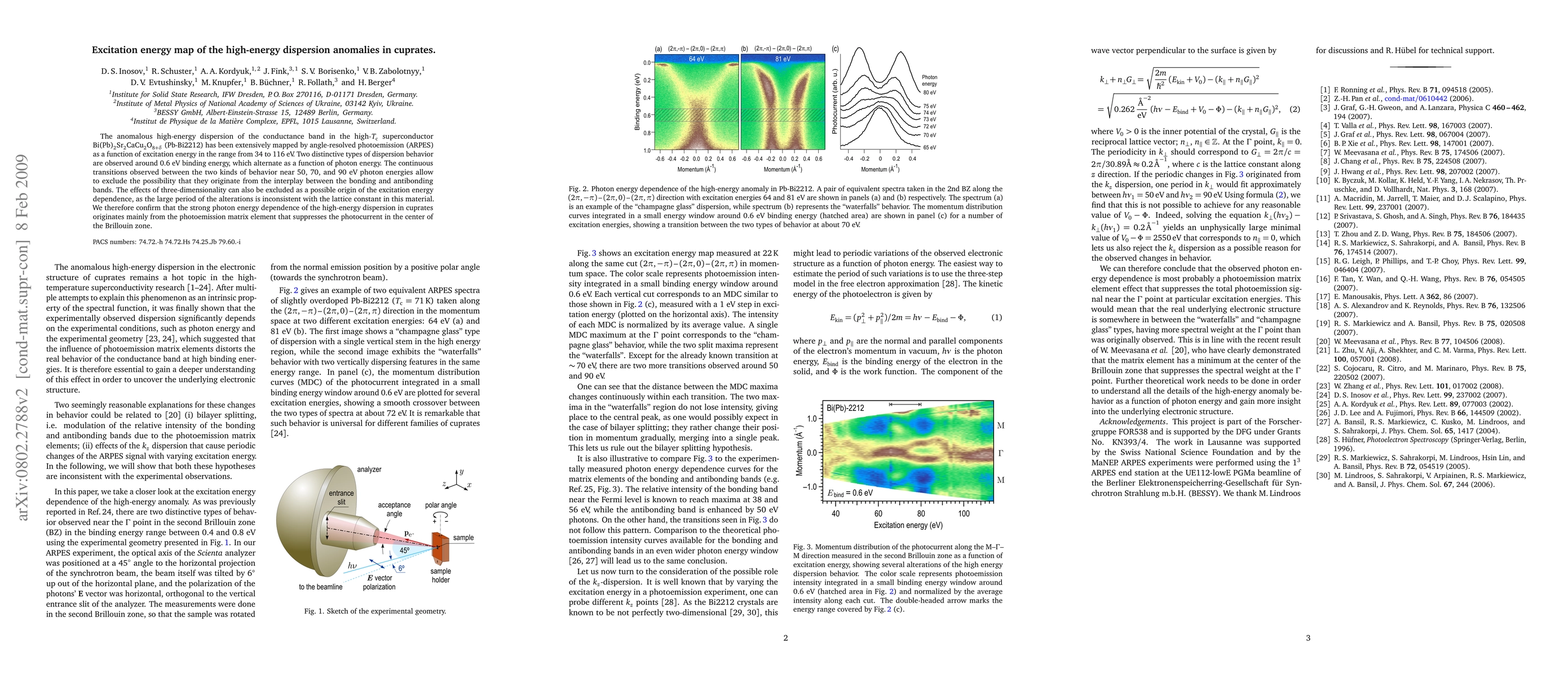 The anomalous high-energy dispersion of the conductance band in the high-Tc superconductor Pb-Bi2212 has been extensively mapped by angle-resolved photoemission (ARPES) as a function of excitation energy in the range from 34 to 116 eV. Two distinctive types of dispersion behavior are observed around 0.6 eV binding energy, which alternate as a function of photon energy. The continuous transitions observed between the two kinds of behavior near 50, 70, and 90 eV photon energies allow to exclude the possibility that they originate from the interplay between the bonding and antibonding bands. The effects of three-dimensionality can also be excluded as a possible origin of the excitation energy dependence, as the large period of the alterations is inconsistent with the lattice constant in this material. We therefore confirm that the strong photon energy dependence of the high-energy dispersion in cuprates originates mainly from the photoemission matrix element that suppresses the photocurrent in the center of the Brillouin zone.