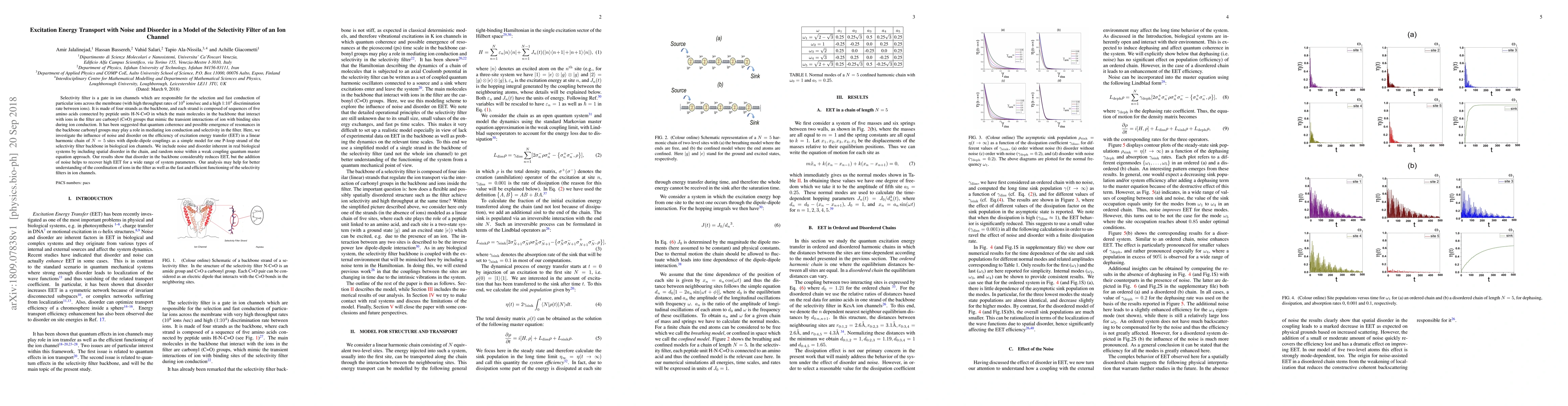 This study models a segment of an ion channel's selectivity filter, crucial for ion conduction and discrimination, using a quantum approach. It demonstrates that disorder hampers energy transfer but noise, when added, can enhance it, offering insights into the efficient functioning of ion channels.