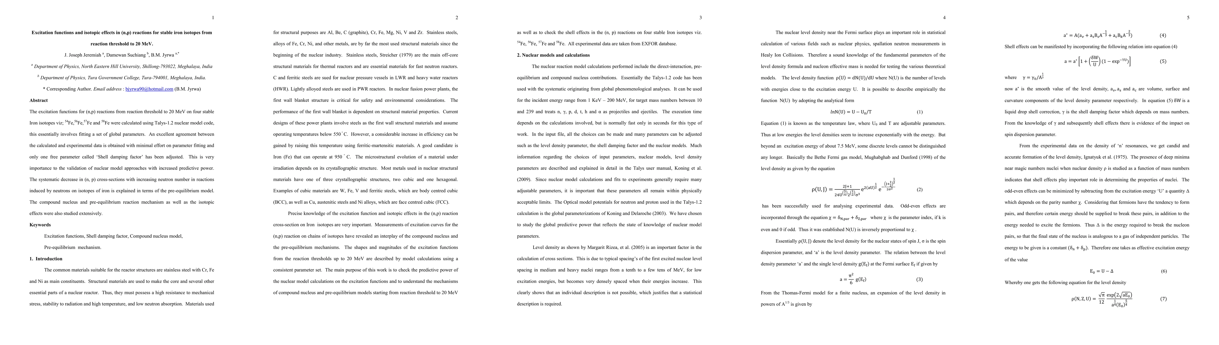 This paper investigates (n,p) reaction excitation functions for four stable iron isotopes using the Talys-1.2 nuclear model, achieving good agreement with experimental data. The study highlights the systematic decrease in cross-sections with neutron number and explores the compound nucleus and pre-equilibrium mechanisms, emphasizing isotopic effects.