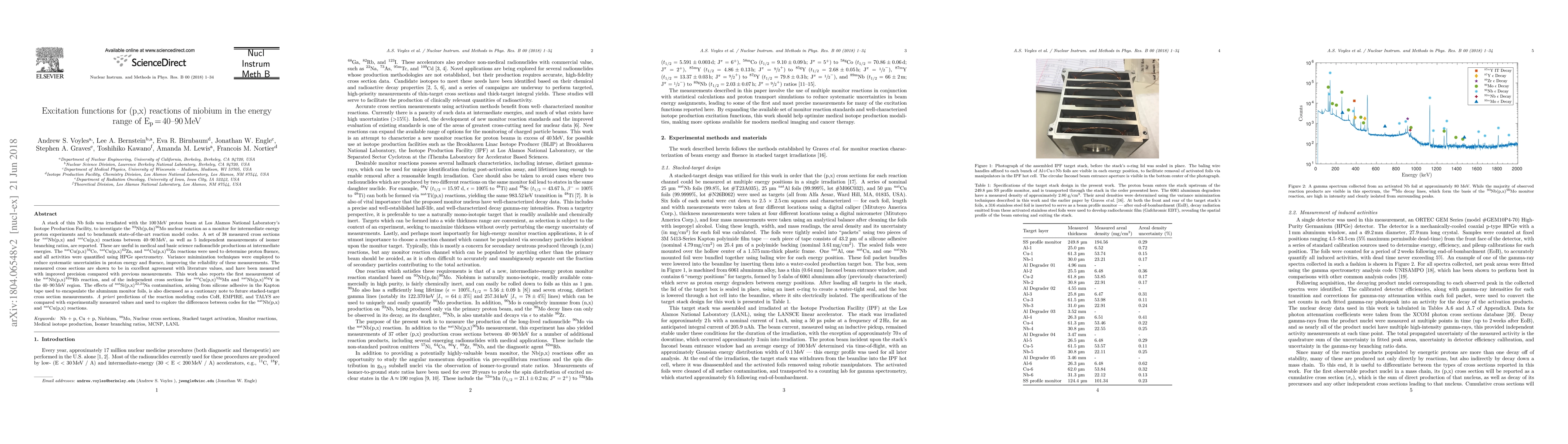 A stack of thin Nb foils was irradiated with the 100 MeV proton beam at Los Alamos National Laboratory's Isotope Production Facility, to investigate the $^{93}$Nb(p,4n)$^{90}$Mo nuclear reaction as a monitor for intermediate energy proton experiments and to benchmark state-of-the-art reaction model codes. A set of 38 measured cross sections for $^{\text{nat}}$Nb(p,x) and $^{\text{nat}}$Cu(p,x) reactions between 40-90 MeV, as well as 5 independent measurements of isomer branching ratios, are reported. These are useful in medical and basic science radionuclide productions at intermediate energies. The $^{\text{nat}}$Cu(p,x)$^{56}$Co, $^{\text{nat}}$Cu(p,x)$^{62}$Zn, and $^{\text{nat}}$Cu(p,x)$^{65}$Zn reactions were used to determine proton fluence, and all activities were quantified using HPGe spectrometry. Variance minimization techniques were employed to reduce systematic uncertainties in proton energy and fluence, improving the reliability of these measurements. The measured cross sections are shown to be in excellent agreement with literature values, and have been measured with improved precision compared with previous measurements. This work also reports the first measurement of the $^{\text{nat}}$Nb(p,x)$^{82\text{m}}$Rb reaction, and of the independent cross sections for $^{\text{nat}}$Cu(p,x)$^{52\text{g}}$Mn and $^{\text{nat}}$Nb(p,x)$^{85\text{g}}$Y in the 40-90 MeV region. The effects of $^{\text{nat}}$Si(p,x)$^{22,24}$Na contamination, arising from silicone adhesive in the Kapton tape used to encapsulate the aluminum monitor foils, is also discussed as a cautionary note to future stacked-target cross section measurements. \emph{A priori} predictions of the reaction modeling codes CoH, EMPIRE, and TALYS are compared with experimentally measured values and used to explore the differences between codes for the $^{\text{nat}}$Nb(p,x) and $^{\text{nat}}$Cu(p,x) reactions.