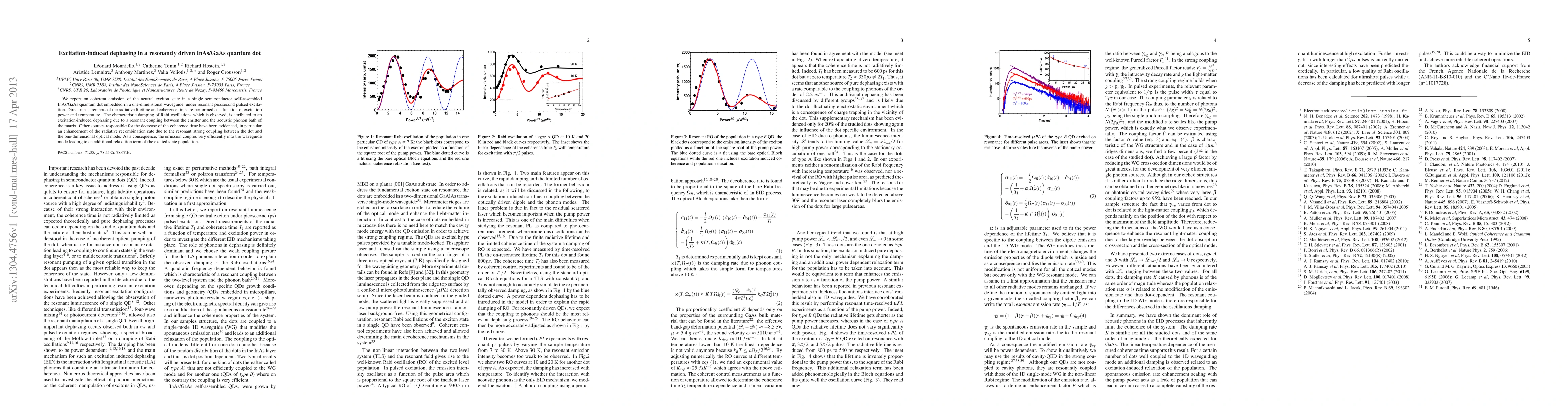 This paper investigates coherent exciton emission in a self-assembled InAs/GaAs quantum dot under resonant excitation, revealing excitation-induced dephasing due to phonon coupling and enhanced radiative recombination from strong coupling with a waveguide mode. The study identifies multiple factors affecting coherence time.