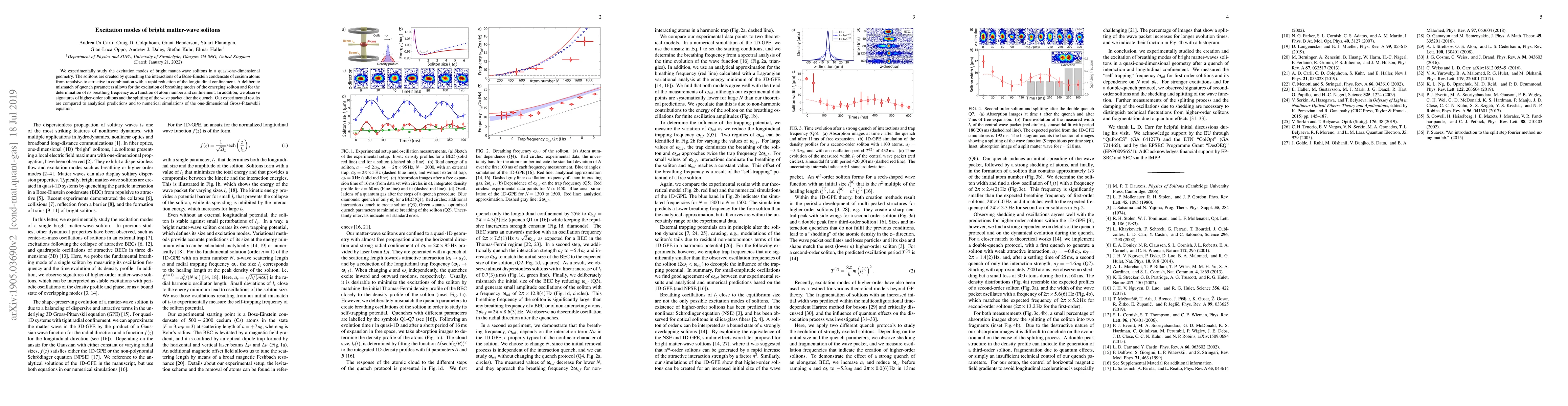This paper investigates the excitation modes of bright matter-wave solitons in a quasi-one-dimensional Bose-Einstein condensate, revealing the breathing frequency and higher-order solitons. Experimental results are corroborated with analytical predictions and numerical simulations based on the Gross-Pitaevskii equation.