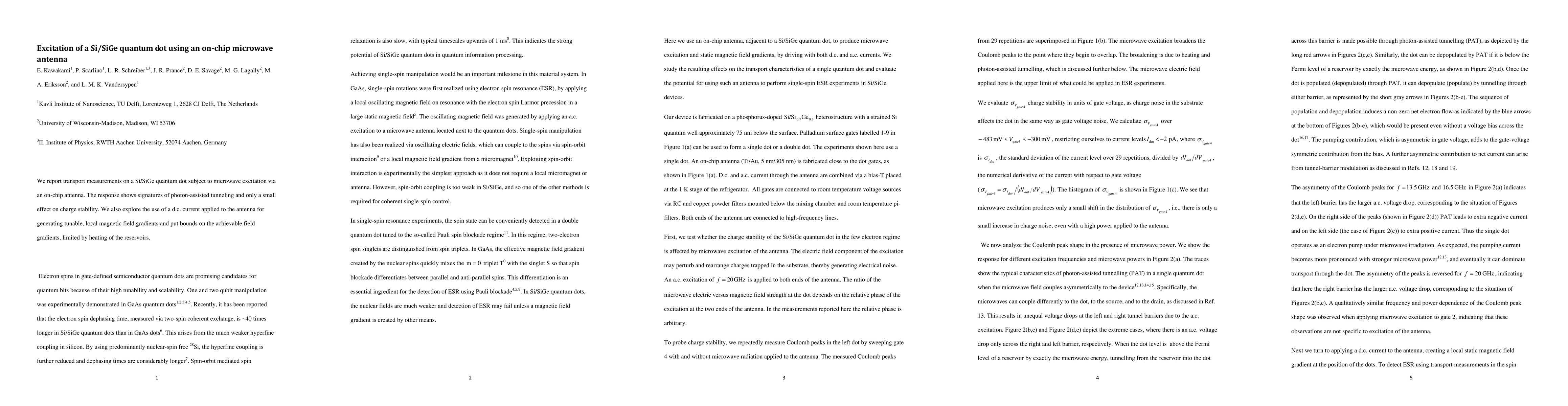 This paper investigates transport in a Si/SiGe quantum dot excited by an on-chip microwave antenna, revealing photon-assisted tunneling effects and minimal impact on charge stability. Additionally, it explores the use of a d.c. current to create tunable magnetic field gradients, but finds these are limited by heating effects.