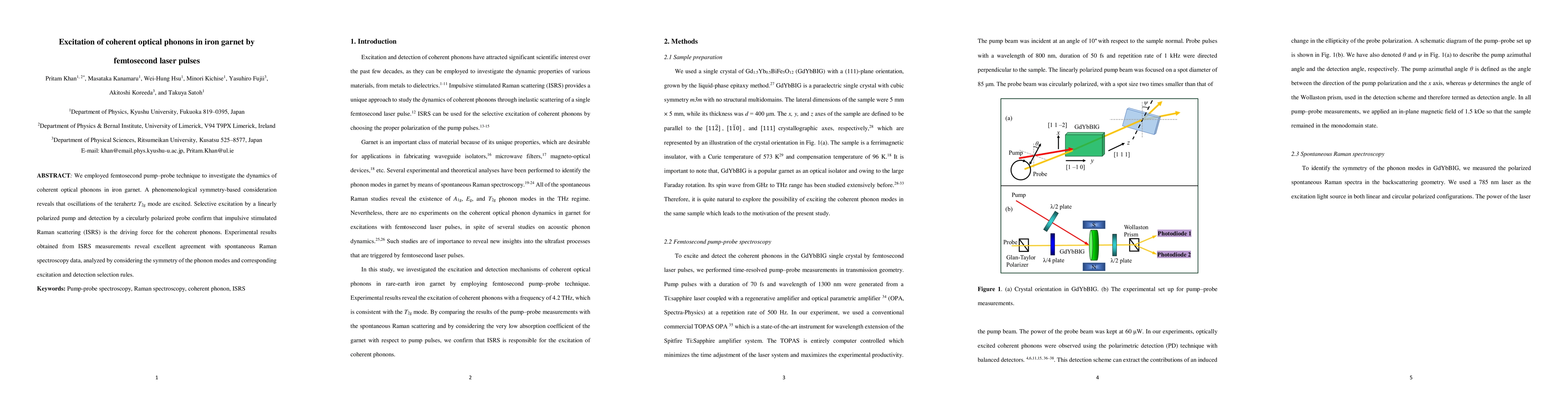 This study uses femtosecond pump-probe techniques to investigate coherent optical phonons in iron garnet, revealing that the terahertz T2g mode oscillations are excited via impulsive stimulated Raman scattering. The findings align well with spontaneous Raman spectroscopy data, confirming the role of symmetry in phonon mode excitation and selection rules.