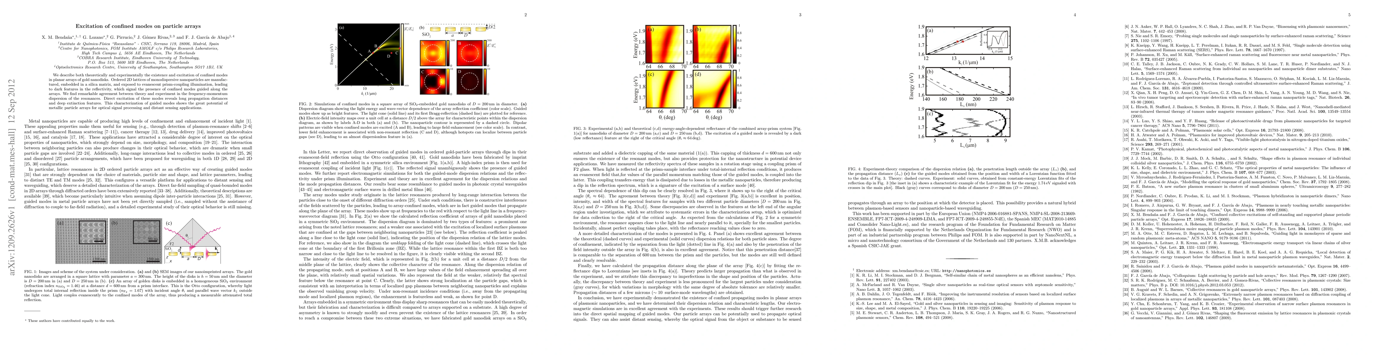 We describe both theoretically and experimentally the existence and excitation of confined modes in planar arrays of gold nanodisks. Ordered 2D lattices of monodispersive nanoparticles are manufactured, embedded in a silica matrix, and exposed to evanescent prism-coupling illumination, leading to dark features in the reflectivity, which signal the presence of confined modes guided along the arrays. We find remarkable agreement between theory and experiment in the frequency-momentum dispersion of the resonances. Direct excitation of these modes reveals long propagation distances and deep extinction features. This characterization of guided modes shows the great potential of metallic particle arrays for optical signal processing and distant sensing applications.