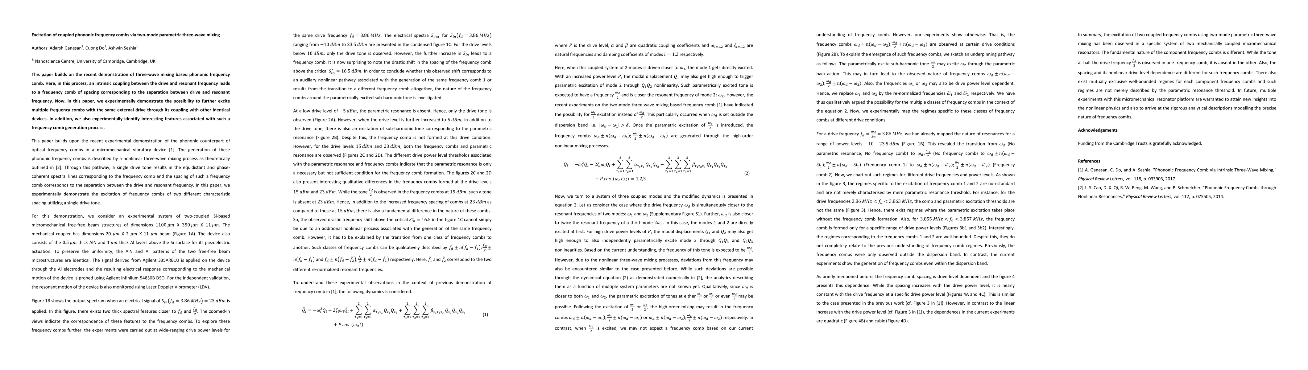 This paper experimentally demonstrates the excitation of multiple coupled phononic frequency combs via two-mode parametric three-wave mixing, showcasing the intrinsic coupling between drive and resonant frequencies, and identifying notable features of the comb generation process.