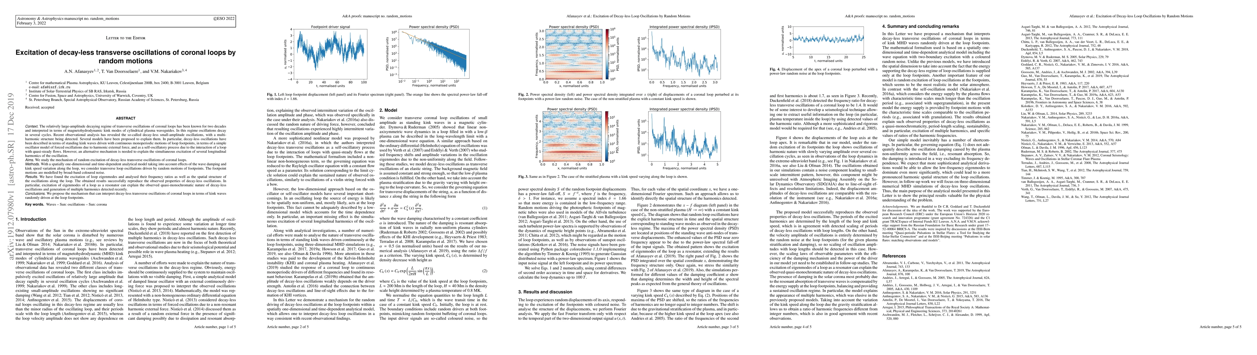 This paper investigates the excitation of decay-less transverse oscillations in coronal loops by random motions at their footpoints, proposing that these oscillations arise from random excitation of loop eigenmodes. The study uses a one-dimensional analytical model to demonstrate how broad-band noise can generate multiple harmonics and reproduce observed properties of decay-less oscillations.