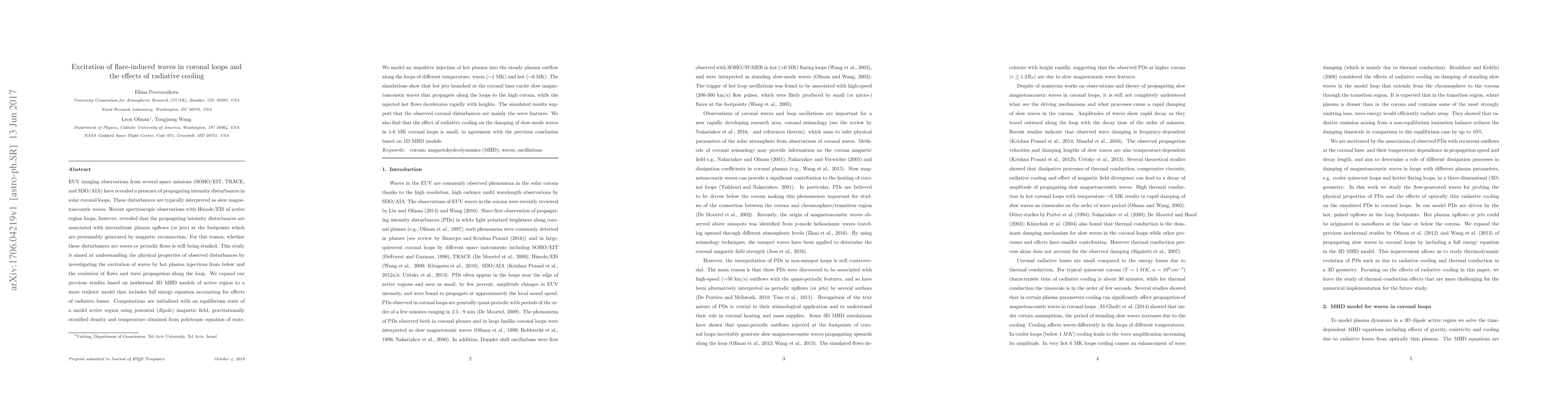 This study investigates the excitation of flare-induced waves in coronal loops using 3D MHD models that include radiative cooling. It finds that hot plasma injections excite slow magnetoacoustic waves, which propagate to the high corona, supporting the wave interpretation of observed disturbances.