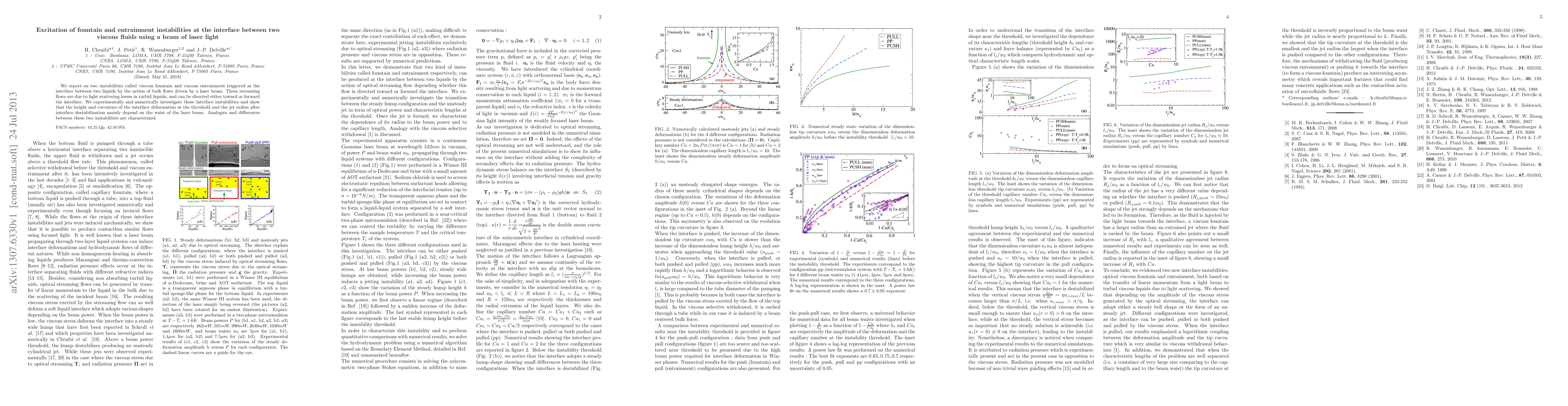 We report on two instabilities called viscous fountain and viscous entrainment triggered at the interface between two liquids by the action of bulk flows driven by a laser beam. These streaming flows are due to light scattering losses in turbid liquids, and can be directed either toward or forward the interface. We experimentally and numerically investigate these interface instabilities and show that the height and curvature of the interface deformation at the threshold and the jet radius after interface destabilization mainly depend on the waist of the laser beam. Analogies and differences between these two instabilities are characterized.