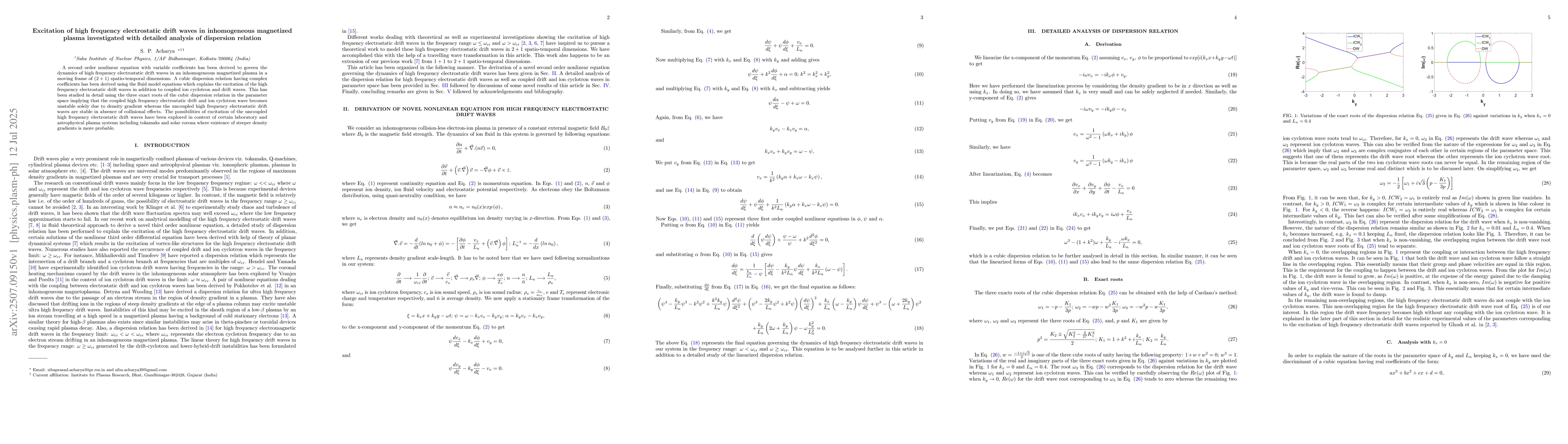 A second order nonlinear equation with variable coefficients has been derived to govern the dynamics of high frequency electrostatic drift waves in an inhomogeneous magnetized plasma in a moving frame of (2 + 1) spatio-temporal dimensions. A cubic dispersion relation having complex coefficients has been derived using the fluid model equations which explains the excitation of the high frequency electrostatic drift waves in addition to coupled ion cyclotron and drift waves. This has been studied in detail using the three exact roots of the cubic dispersion relation in the parameter space implying that the coupled high frequency electrostatic drift and ion cyclotron wave becomes unstable solely due to density gradient whereas the uncoupled high frequency electrostatic drift waves are stable in absence of collisional effects. The possibilities of excitation of the uncoupled high frequency electrostatic drift waves have been explored in context of certain laboratory and astrophysical plasma systems including tokamaks and solar corona where existence of steeper density gradients is more probable.