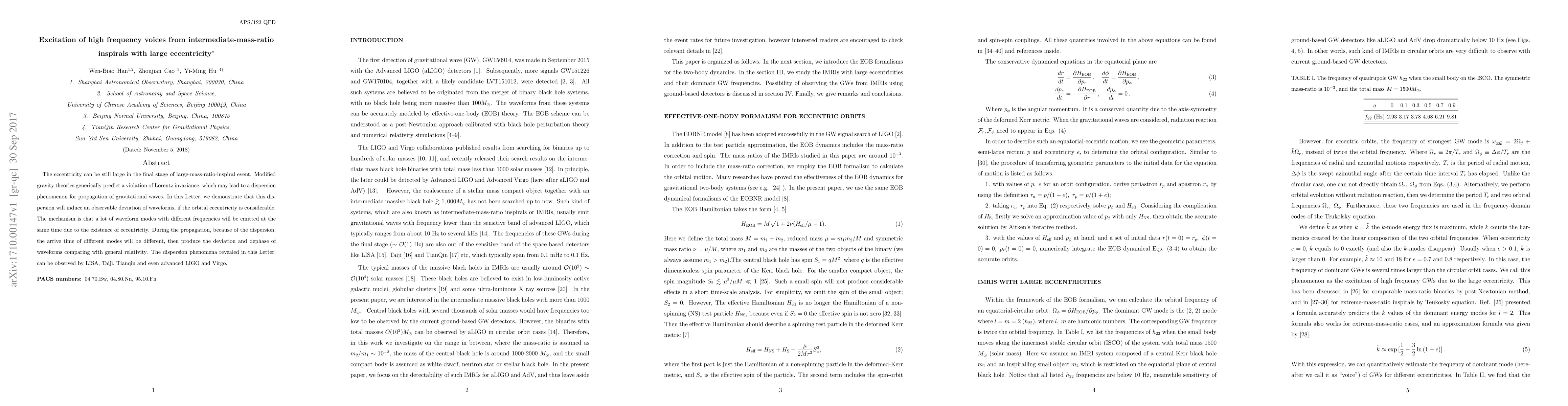 The paper presents a detailed analysis of gravitational waveforms from eccentric intermediate-mass-ratio inspirals using the Teukolsky equation and effective-one-body formalism, identifying high-frequency modes that could be detectable by current ground-based detectors.