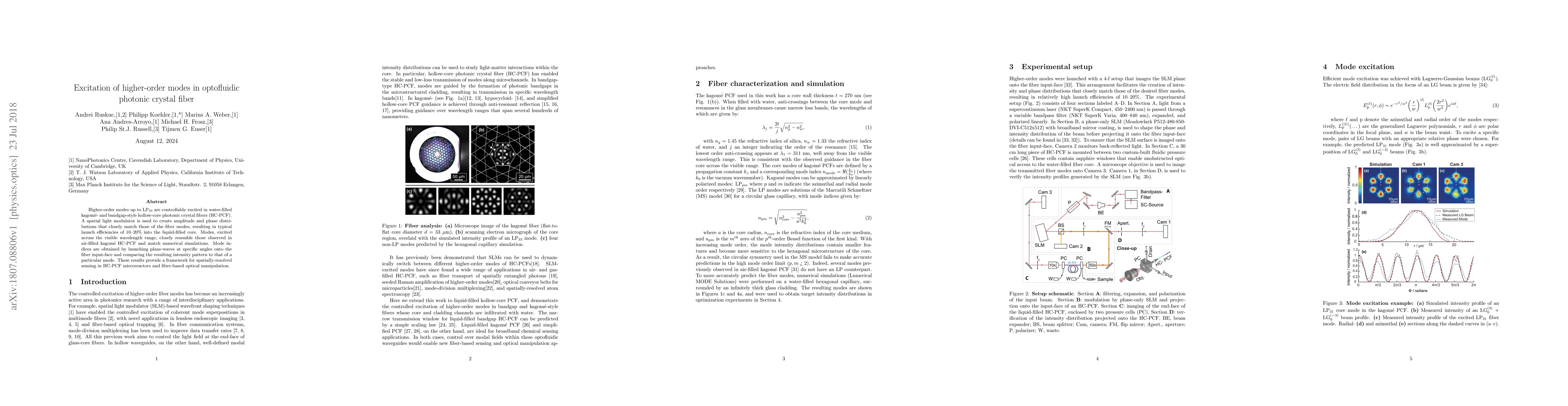 Higher-order modes up to LP$_{33}$ are controllably excited in water-filled kagom\'{e}- and bandgap-style hollow-core photonic crystal fibers (HC-PCF). A spatial light modulator is used to create amplitude and phase distributions that closely match those of the fiber modes, resulting in typical launch efficiencies of 10-20% into the liquid-filled core. Modes, excited across the visible wavelength range, closely resemble those observed in air-filled kagom\'{e} HC-PCF and match numerical simulations. Mode indices are obtained by launching plane-waves at specific angles onto the fiber input-face and comparing the resulting intensity pattern to that of a particular mode. These results provide a framework for spatially-resolved sensing in HC-PCF microreactors and fiber-based optical manipulation.
