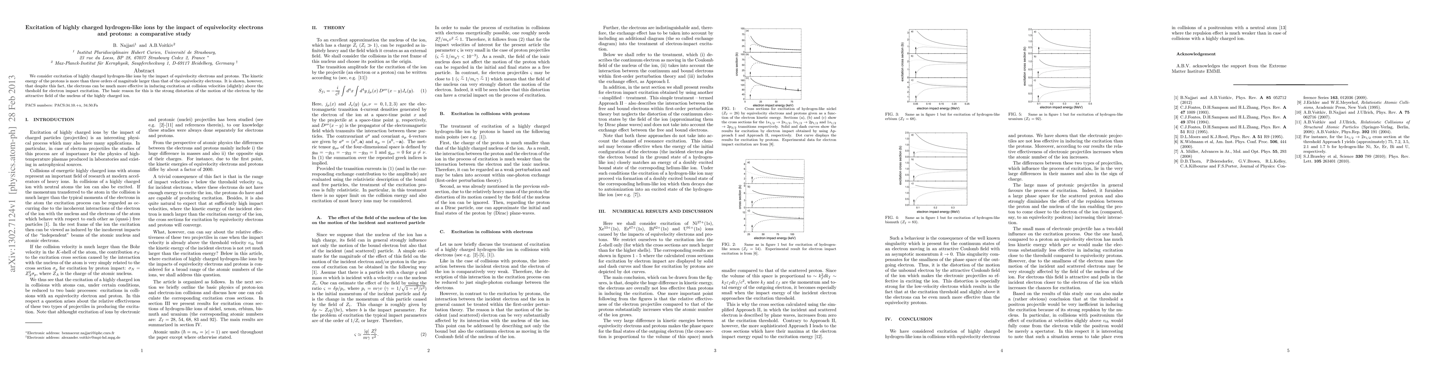 This study compares the excitation of highly charged hydrogen-like ions by equivelocity electrons and protons, revealing that despite protons' significantly higher kinetic energy, electrons are more effective in inducing excitation due to the strong attraction of the ion's nucleus distorting the electron's trajectory.