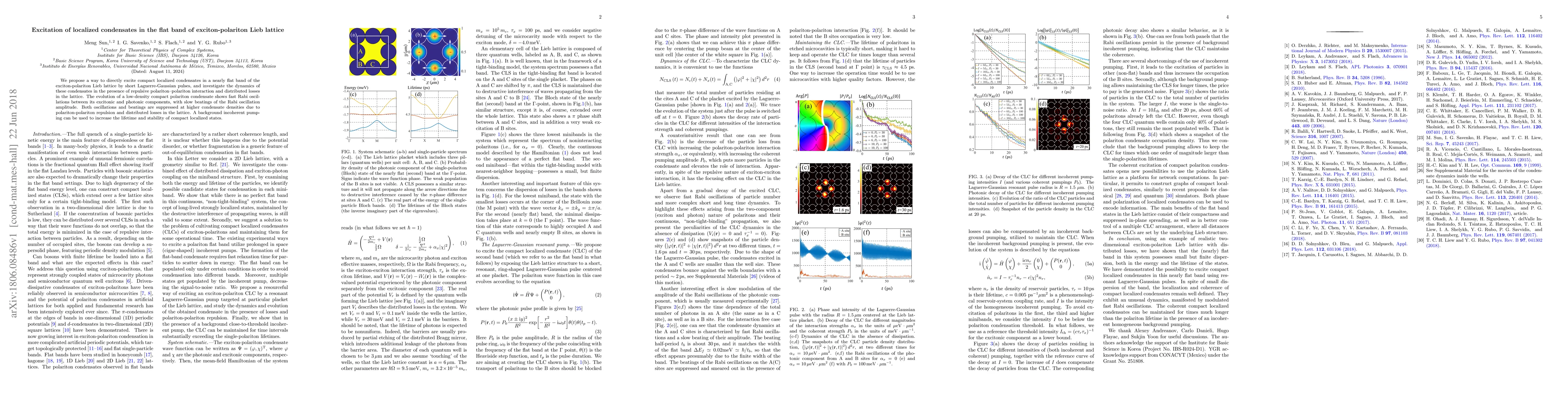 This paper explores the excitation of localized condensates in the flat band of an exciton-polariton Lieb lattice using short Laguerre-Gaussian pulses. It investigates the dynamics of these condensates under repulsive interactions and distributed losses, revealing fast Rabi oscillations and amplitude beatings at lower densities, which are suppressed at higher densities due to these factors.