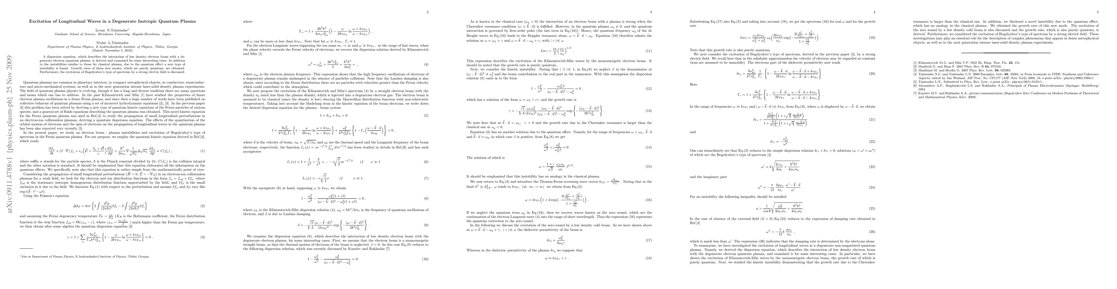 This paper derives a dispersion equation for the interaction of a low density electron beam with a degenerate electron quantum plasma, revealing new quantum-induced instabilities alongside classical ones. It also explores the excitation of Bogolyubov's spectrum under strong electric fields.