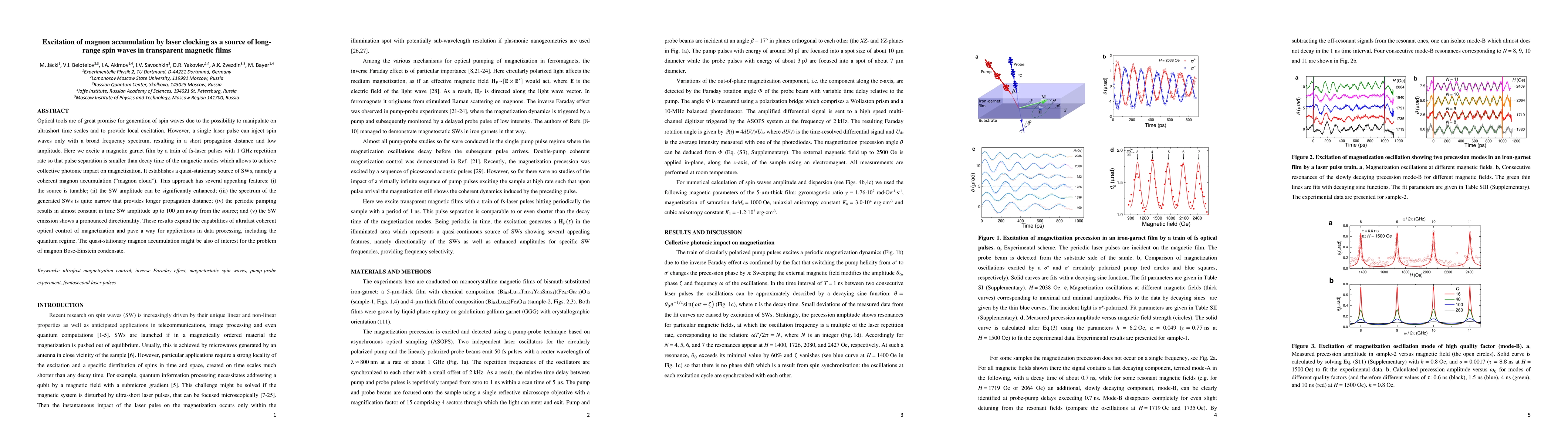 This research demonstrates the use of a train of femtosecond laser pulses to generate a coherent magnon accumulation in transparent magnetic films, resulting in long-range spin waves with enhanced amplitude and narrow frequency spectrum. This approach enables tunable, directional, and sustained spin wave generation, promising applications in data processing and quantum technologies.