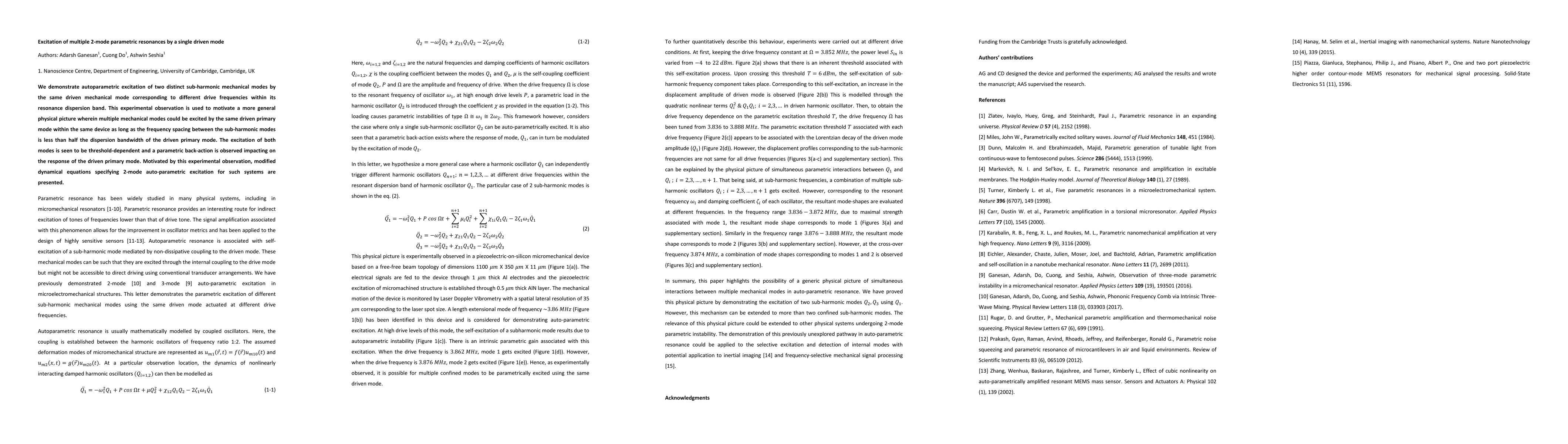 We demonstrate autoparametric excitation of two distinct sub-harmonic mechanical modes by the same driven mechanical mode corresponding to different drive frequencies within its resonance dispersion band. This experimental observation is used to motivate a more general physical picture wherein multiple mechanical modes could be excited by the same driven primary mode within the same device as long as the frequency spacing between the sub-harmonic modes is less than half the dispersion bandwidth of the driven primary mode. The excitation of both modes is seen to be threshold-dependent and a parametric back-action is observed impacting on the response of the driven primary mode. Motivated by this experimental observation, modified dynamical equations specifying 2-mode auto-parametric excitation for such systems are presented.