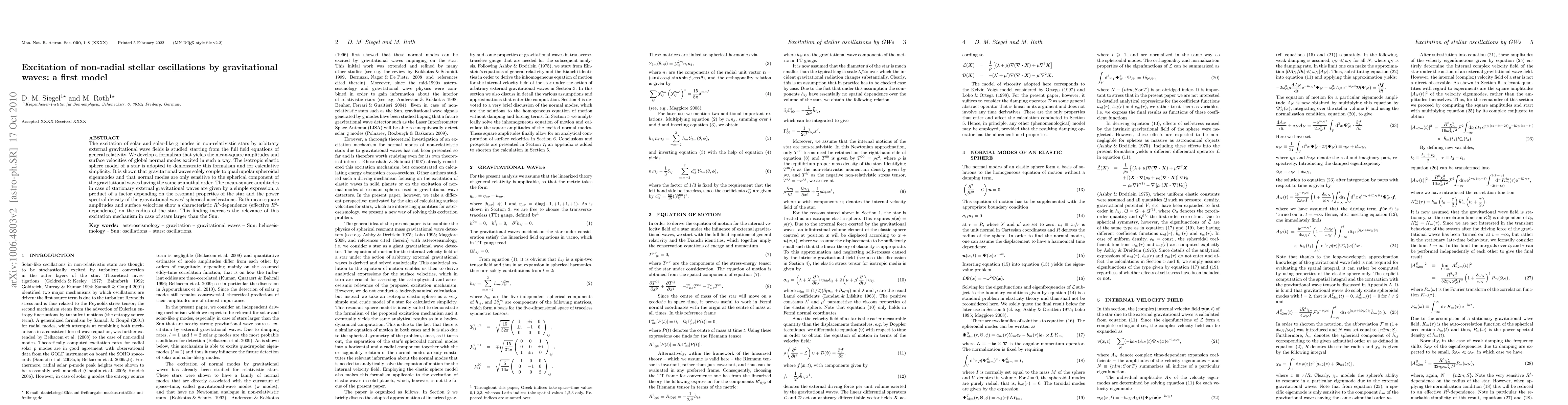 The excitation of solar and solar-like g modes in non-relativistic stars by arbitrary external gravitational wave fields is studied starting from the full field equations of general relativity. We develop a formalism that yields the mean-square amplitudes and surface velocities of global normal modes excited in such a way. The isotropic elastic sphere model of a star is adopted to demonstrate this formalism and for calculative simplicity. It is shown that gravitational waves solely couple to quadrupolar spheroidal eigenmodes and that normal modes are only sensitive to the spherical component of the gravitational waves having the same azimuthal order. The mean-square amplitudes in case of stationary external gravitational waves are given by a simple expression, a product of a factor depending on the resonant properties of the star and the power spectral density of the gravitational waves' spherical accelerations. Both mean-square amplitudes and surface velocities show a characteristic R^8-dependence (effective R^2-dependence) on the radius of the star. This finding increases the relevance of this excitation mechanism in case of stars larger than the Sun.
