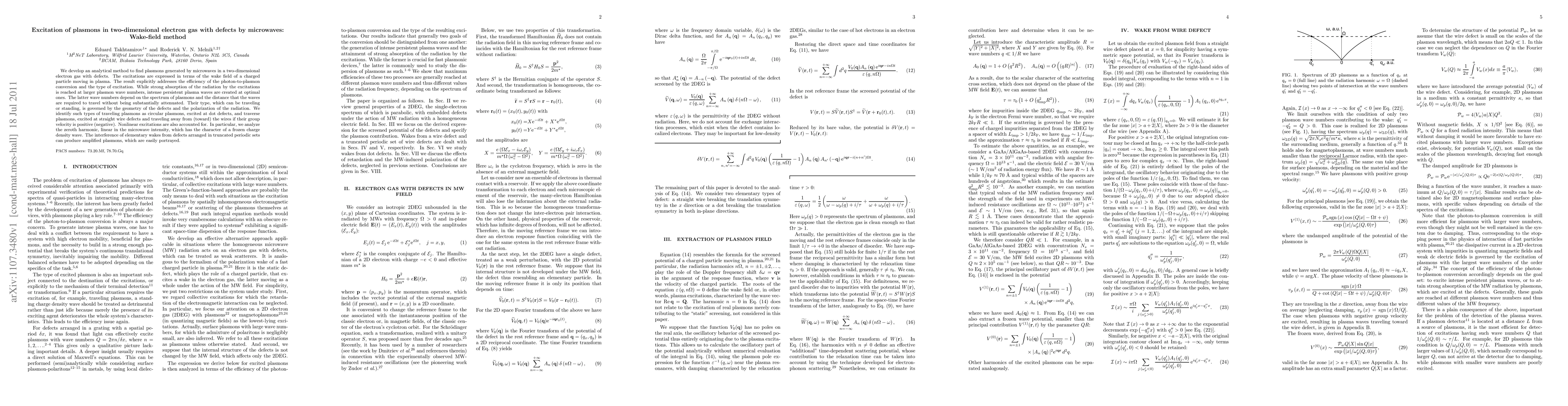 We develop an analytical method to find plasmons generated by microwaves in a two-dimensional electron gas with defects. The excitations are expressed in terms of the wake field of a charged particle moving in plasma. The result explicitly addresses the efficiency of the photon-to-plasmon conversion and the type of excitation. While strong absorption of the radiation by the excitations is reached at larger plasmon wave numbers, intense persistent plasma waves are created at optimal ones. The latter wave numbers depend on the spectrum of plasmons and the distance that the waves are required to travel without being substantially attenuated. Their type, which can be traveling or standing, is governed by the geometry of the defects and the polarization of the radiation. We identify such types of traveling plasmons as circular plasmons, excited at dot defects, and traverse plasmons, excited at straight wire defects and traveling away from (toward) the wires if their group velocity is positive (negative). Nonlinear excitations are also accounted for. In particular, we analyze the zeroth harmonic, linear in the microwave intensity, which has the character of a frozen charge density wave. The interference of elementary wakes from defects arranged in truncated periodic sets can produce amplified plasmons, which are easily portrayed.