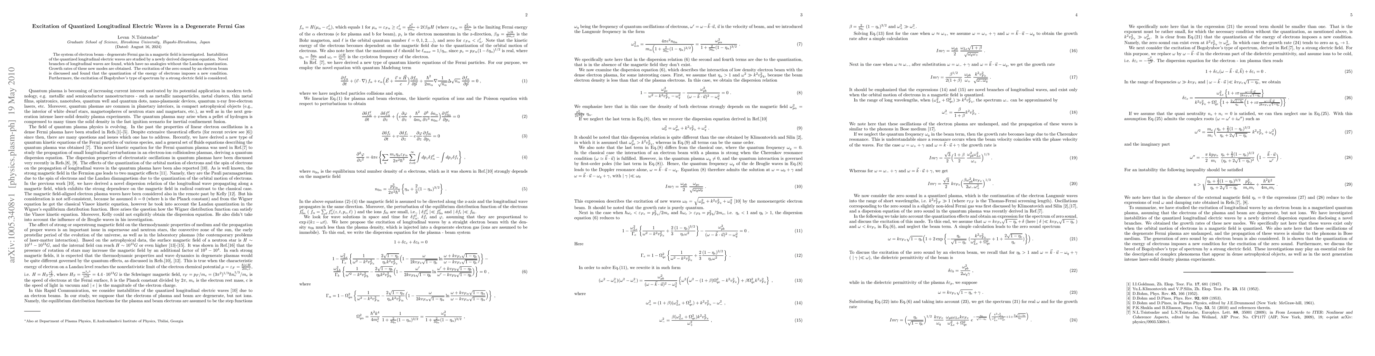 This paper investigates the excitation of quantized longitudinal electric waves in a degenerate Fermi gas under a magnetic field, revealing new wave branches and growth rates through a newly derived dispersion equation. The study also discusses the impact of electron energy quantization on zero sound excitation and the influence of strong electric fields on Bogolyubov's spectrum.