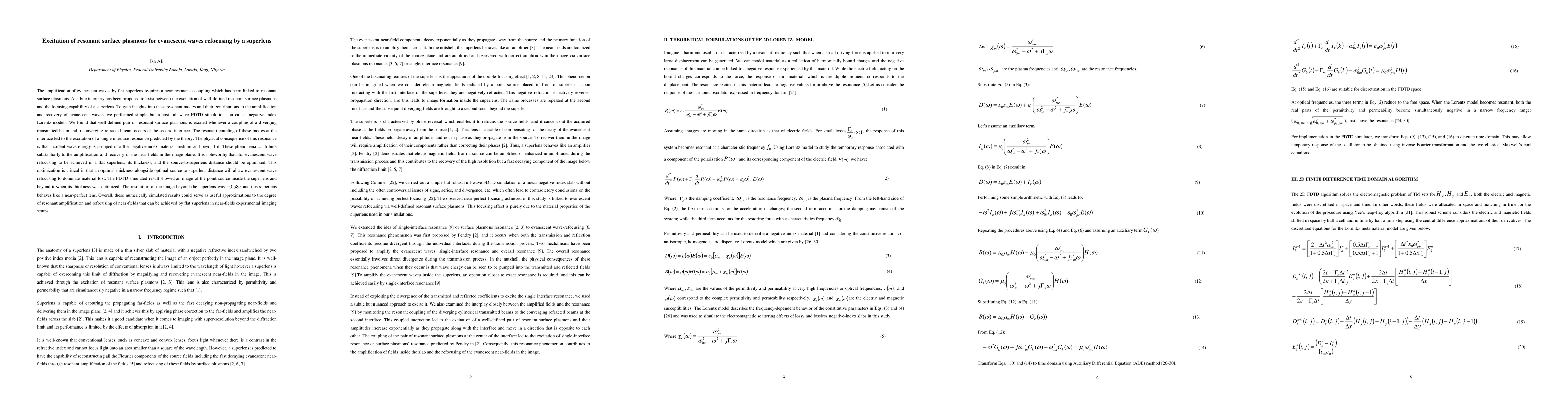 The amplification of evanescent waves by flat superlens requires a near-resonance coupling which has been linked to resonant surface plasmons. A subtle interplay has been proposed to exist between the excitation of well-defined resonant surface plasmons and the focusing capability of a superlens. To gain insights into these resonant modes and their contributions to the amplification and recovery of evanescent waves, we performed simple but robust full-wave FDTD simulations on causal negative index Lorentz models. We found that well-defined pair of resonant surface plasmons is excited whenever a coupling of a diverging transmitted beam and a converging refracted beam occurs at the second interface. The resonant coupling of these modes at the interface led to the excitation of a single interface resonance predicted by the theory. The physical consequence of this resonance is that incident wave energy is pumped into the negative-index material medium and beyond it. These phenomena contribute substantially to the amplification and recovery of the near-fields in the image plane. It is noteworthy that, for evanescent wave refocusing to be achieved in a flat superlens, its thickness, and the source-to-superlens distance should be optimized. This optimization is critical in that an optimal thickness alongside optimal source-to-superlens distance will allow evanescent wave refocusing to dominate material lost. The FDTD simulated result showed an image of the point source inside the superlens and beyond it when its thickness was optimized. The resolution of the image beyond the superlens was $\sim.58\lambda$ and this superlens behaves like a near-perfect lens. Overall, these numerically simulated results could serve as useful approximations to the degree of resonant amplification and refocusing of near-fields that can be achieved by flat superlens in near-fields experimental imaging setups.