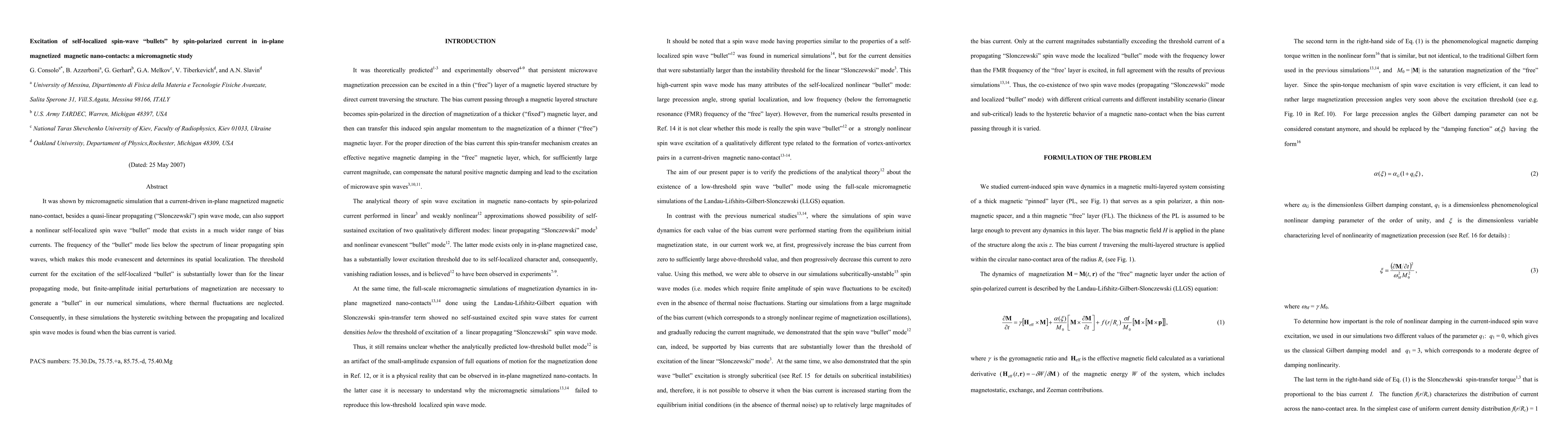 This micromagnetic study reveals that in-plane magnetized magnetic nano-contacts can support nonlinear self-localized spin wave "bullets" excited by spin-polarized current, with a lower threshold than linear propagating modes. The "bullet" mode's frequency lies below that of linear modes, resulting in spatial localization and evanescence.