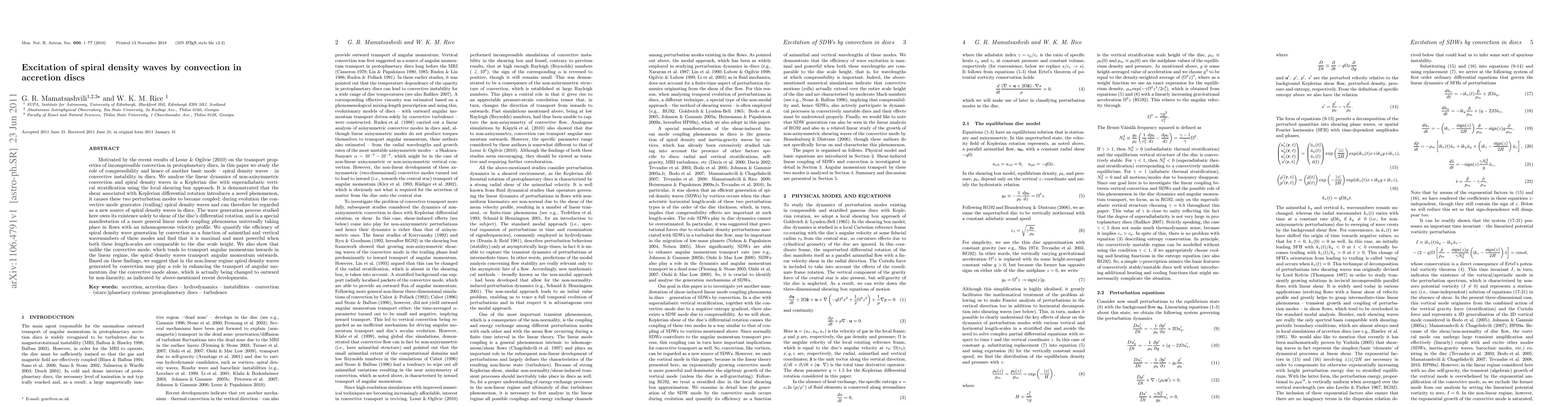 This paper investigates the coupling between convective instability and spiral density waves in accretion discs, demonstrating that shear from Keplerian rotation generates trailing spiral density waves from convection. The study finds that this coupling is most efficient when wave scales match the disc scale height, and suggests that spiral density waves may enhance angular momentum transport in the non-linear regime.