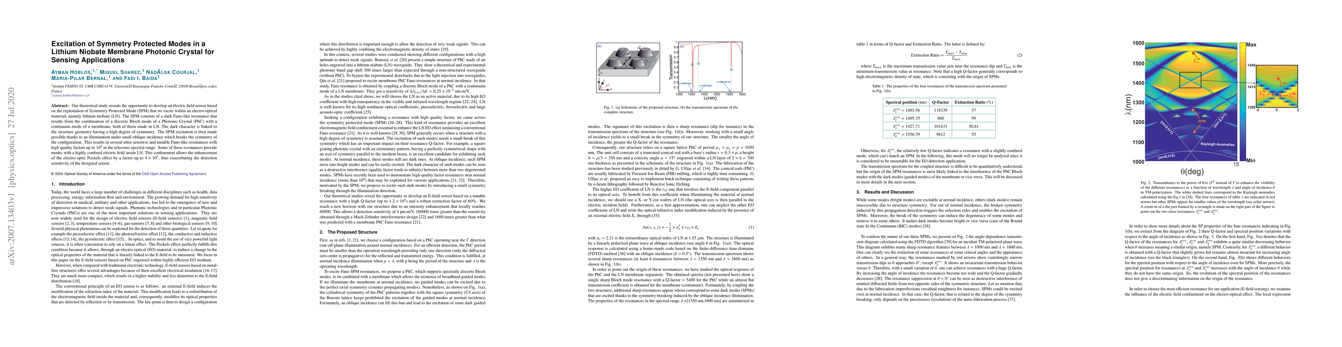 Our theoretical study reveals the opportunity to develop an electric field sensor basedon the exploitation of Symmetry Protected Mode (SPM) that we excite within an electro-opticalmaterial, namely lithium niobate (LN). The SPM consists of a dark Fano-like resonance thatresults from the combination of a discrete Bloch mode of a Photonic Crystal (PhC) with acontinuum mode of a membrane, both of them made in LN. The dark character is linked tothe structure geometry having a high degree of symmetry. The SPM excitation is then madepossible thanks to an illumination under small oblique incidence which breaks the symmetry ofthe configuration. This results in several ultra-sensitive and tunable Fano-like resonances withhigh quality factors up to 10^5 in the telecoms spectral range. Some of these resonances providemodes with a highly confined electric field inside LN. This confinement allows the enhancementof the electro-optic Pockels effect by a factor up to 4x10^5, thus exacerbating the detectionsensitivity of the designed sensor.