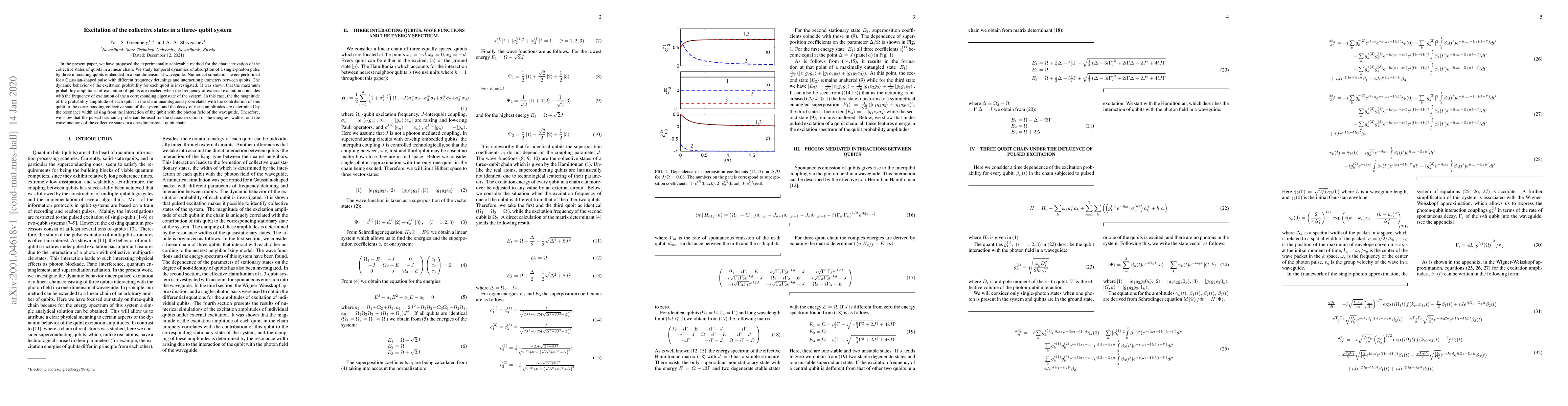 This paper proposes an experimental method to characterize collective states in a three-qubit system by studying the temporal dynamics of single-photon pulse absorption. The method reveals that maximum excitation probabilities correlate with the eigenstate frequencies, enabling the identification of qubit contributions to collective states and the characterization of their energies and decay.