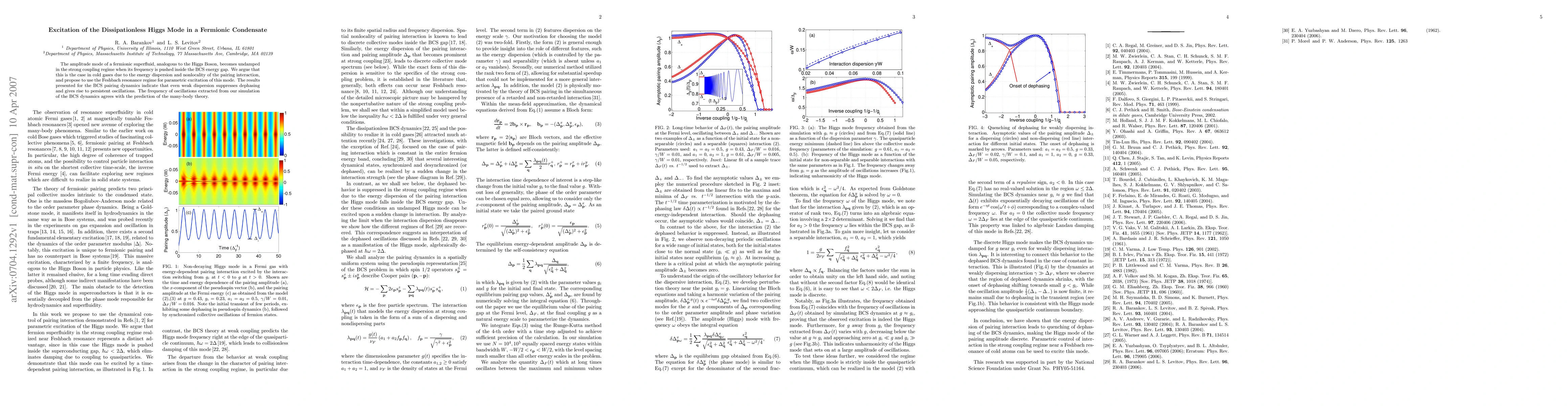 The amplitude mode of a fermionic superfluid, analogous to the Higgs Boson, becomes undamped in the strong coupling regime when its frequency is pushed inside the BCS energy gap. We argue that this is the case in cold gases due to the energy dispersion and nonlocality of the pairing interaction, and propose to use the Feshbach resonance regime for parametric excitation of this mode. The results presented for the BCS pairing dynamics indicate that even weak dispersion suppresses dephasing and gives rise to persistent oscillations. The frequency of oscillations extracted from our simulation of the BCS dynamics agrees with the prediction of the many-body theory.