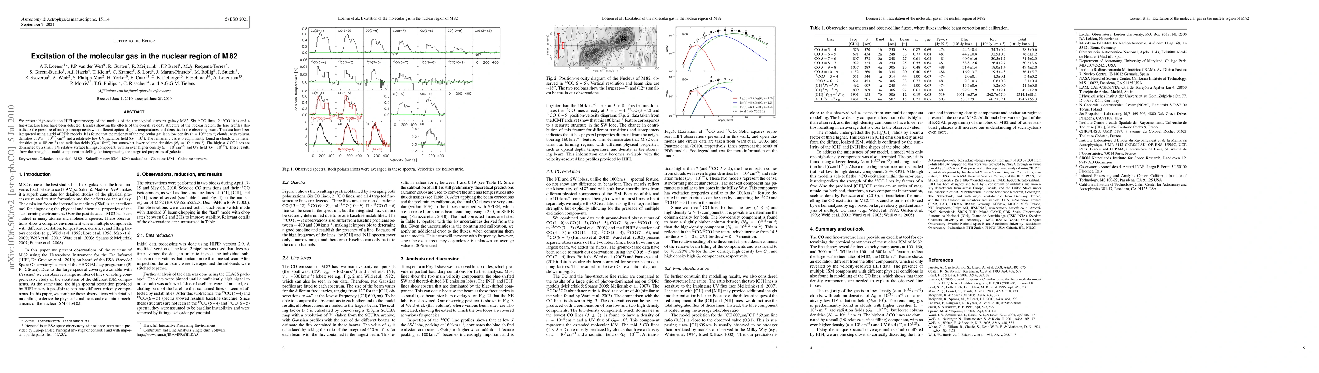 We present high resolution HIFI spectroscopy of the nucleus of the archetypical starburst galaxy M82. Six 12CO lines, 2 13CO lines and 4 fine-structure lines are detected. Besides showing the effects of the overall velocity structure of the nuclear region, the line profiles also indicate the presence of multiple components with different optical depths, temperatures and densities in the observing beam. The data have been interpreted using a grid of PDR models. It is found that the majority of the molecular gas is in low density (n=10^3.5 cm^-3) clouds, with column densities of N_H=10^21.5 cm^-2 and a relatively low UV radiation field (GO = 10^2). The remaining gas is predominantly found in clouds with higher densities (n=10^5 cm^-3) and radiation fields (GO = 10^2.75), but somewhat lower column densities (N_H=10^21.2 cm^-2). The highest J CO lines are dominated by a small (1% relative surface filling) component, with an even higher density (n=10^6 cm^-3) and UV field (GO = 10^3.25). These results show the strength of multi-component modeling for the interpretation of the integrated properties of galaxies.