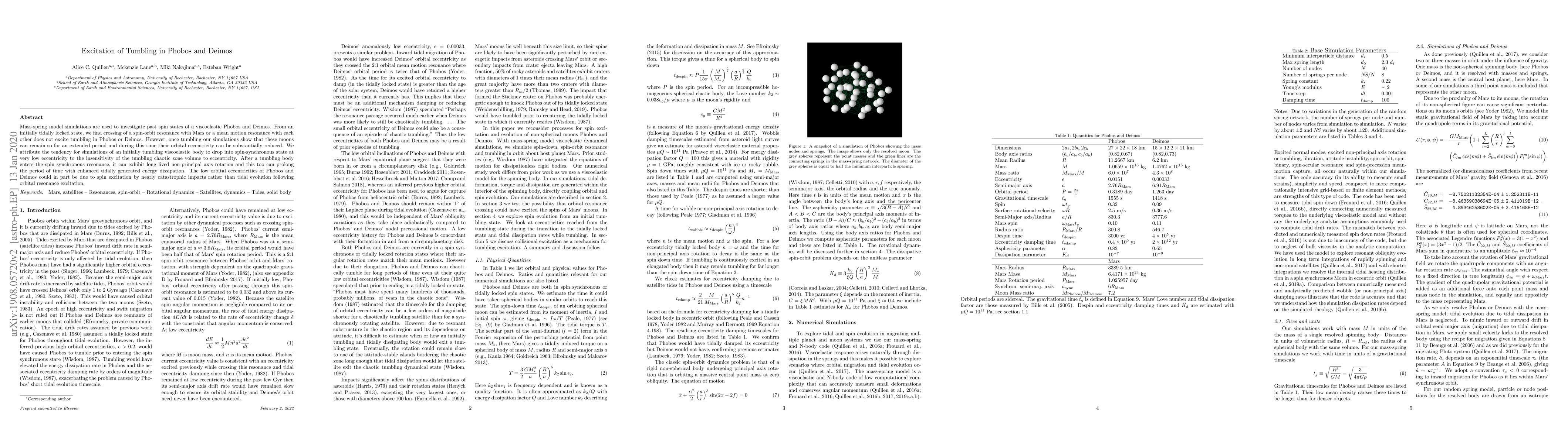 Mass-spring model simulations were used to investigate past spin states of viscoelastic Phobos and Deimos, exploring their tumbling behavior and orbital eccentricity changes.