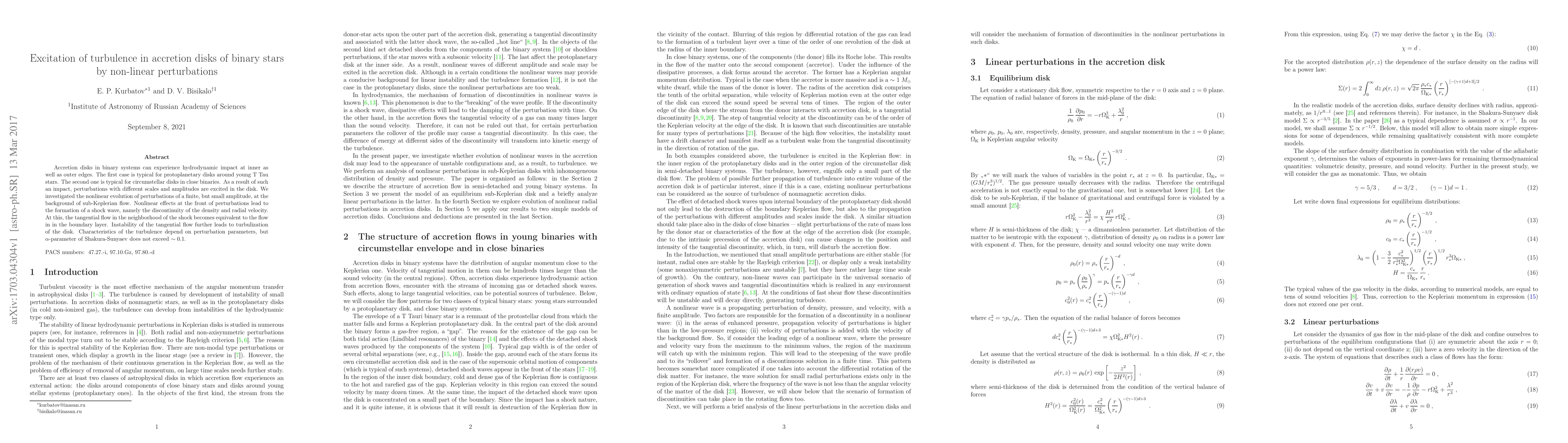 Accretion disks in binary systems can experience hydrodynamic impact at inner as well as outer edges. The first case is typical for protoplanetary disks around young T Tau stars. The second one is typical for circumstellar disks in close binaries. As a result of such an impact, perturbations with different scales and amplitudes are excited in the disk. We investigated the nonlinear evolution of perturbations of a finite, but small amplitude, at the background of sub-Keplerian flow. Nonlinear effects at the front of perturbations lead to the formation of a shock wave, namely the discontinuity of the density and radial velocity. At this, the tangential flow in the neighborhood of the shock becomes equivalent to the flow in in the boundary layer. Instability of the tangential flow further leads to turbulization of the disk. Characteristics of the turbulence depend on perturbation parameters, but alpha-parameter of Shakura-Sunyaev does not exceed ~0.1.