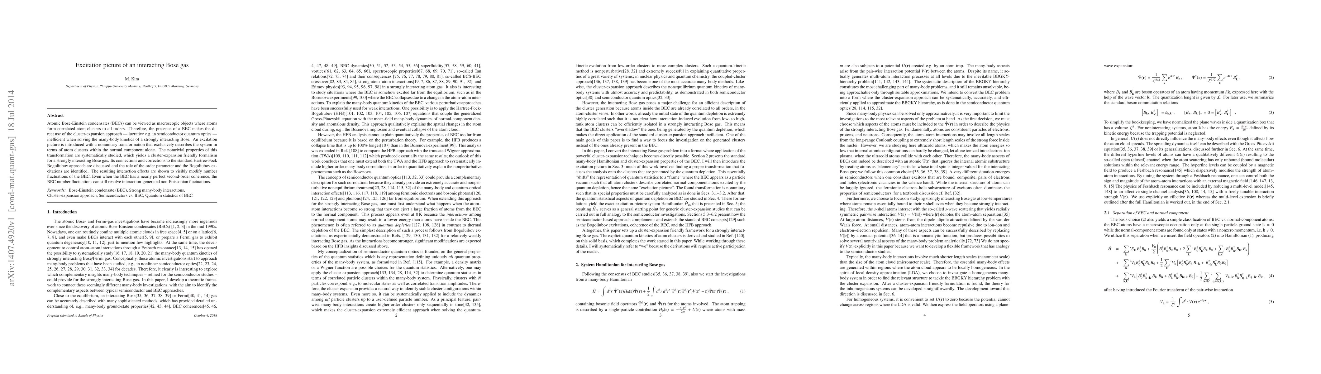 Atomic Bose-Einstein condensates (BECs) can be viewed as macroscopic objects where atoms form correlated atom clusters to all orders. Therefore, the presence of a BEC makes the direct use of the cluster-expansion approach --- lucrative e.g. in semiconductor quantum optics --- inefficient when solving the many-body kinetics of a strongly interacting Bose. An excitation picture is introduced with a nonunitary transformation that exclusively describes the system in terms of atom clusters within the normal component alone. The nontrivial properties of this transformation are systematically studied, which yields a cluster-expansion friendly formalism for a strongly interacting Bose gas. Its connections and corrections to the standard Hartree-Fock Bogoliubov approach are discussed and the role of the order parameter and the Bogoliubov excitations are identified. The resulting interaction effects are shown to visibly modify number fluctuations of the BEC. Even when the BEC has a nearly perfect second-order coherence, the BEC number fluctuations can still resolve interaction-generated non-Poissonian fluctuations.