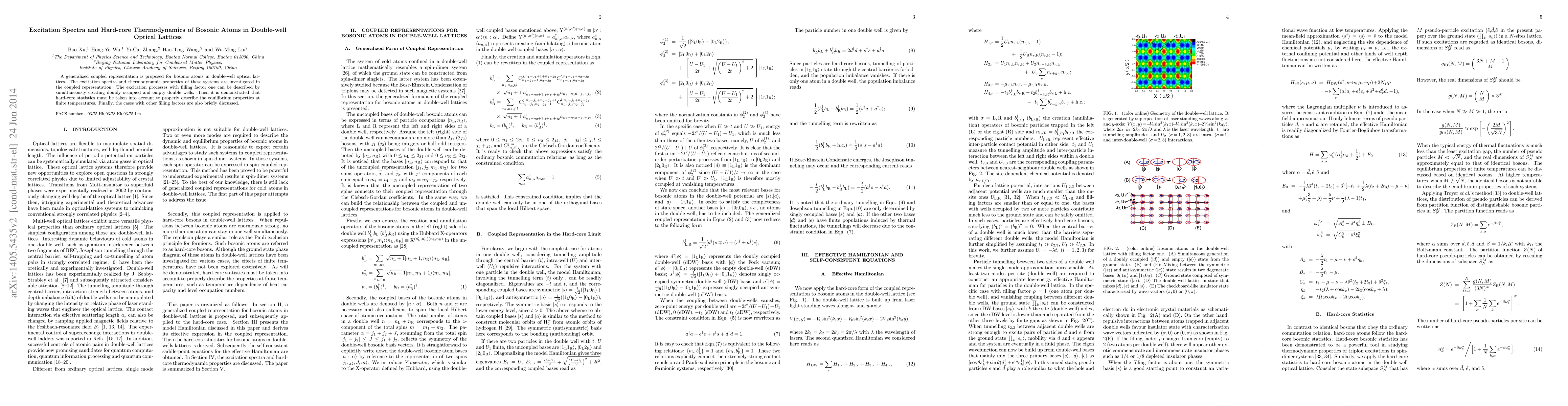 This paper proposes a coupled representation for bosonic atoms in double well optical lattices, analyzing their excitation spectra and thermodynamics. It finds that the excitation spectra can be described by pseudo particles, and highlights the necessity of hard-core bosonic statistics to accurately depict equilibrium properties at finite temperatures, showing this through temperature-dependent curves of particle numbers and heat capacity.