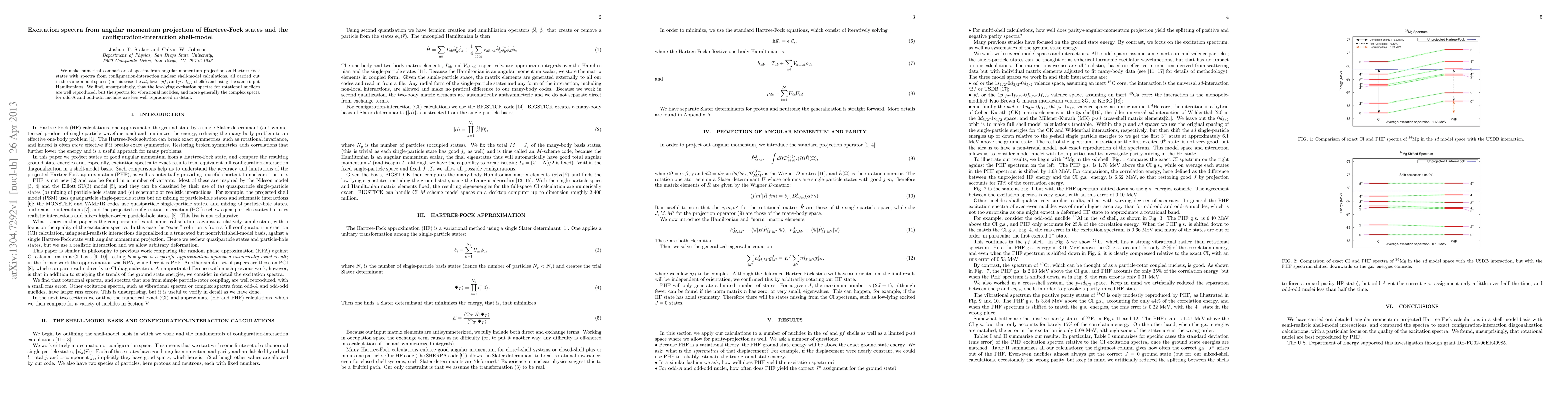 This paper compares excitation spectra derived from angular momentum projection on Hartree-Fock states with those from configuration-interaction nuclear shell-model calculations, finding good agreement for rotational nuclides but less detail for vibrational nuclides and complex spectra of odd-A and odd-odd nuclides.
