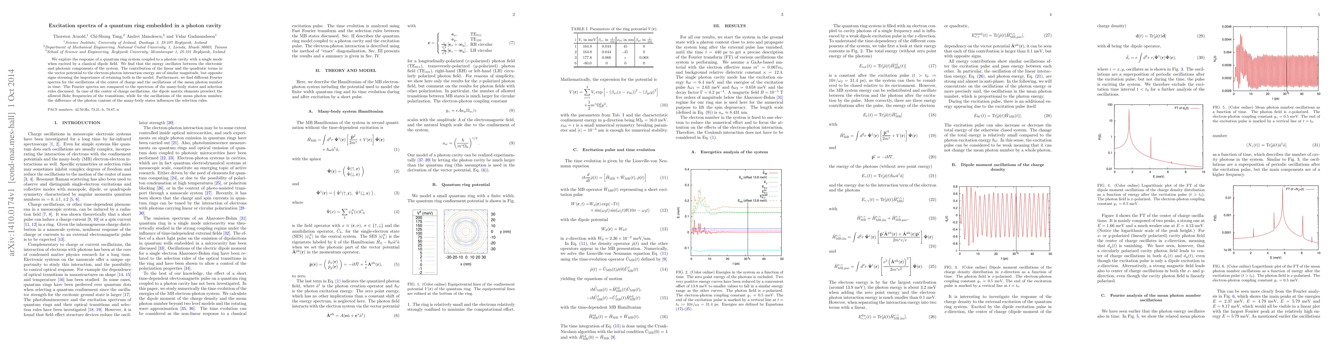 We explore the response of a quantum ring system coupled to a photon cavity with a single mode when excited by a classical dipole field. We find that the energy oscillates between the electronic and photonic components of the system. The contribution of the linear and the quadratic terms in the vector potential to the electron-photon interaction energy are of similar magnitude, but opposite signs stressing the importance of retaining both in the model. Furthermore, we find different Fourier spectra for the oscillations of the center of charge and the oscillations of the mean photon number in time. The Fourier spectra are compared to the spectrum of the many-body states and selection rules discussed. In case of the center of charge oscillations, the dipole matrix elements preselect the allowed Bohr frequencies of the transitions, while for the oscillations of the mean photon number, the difference of the photon content of the many-body states influences the selection rules.