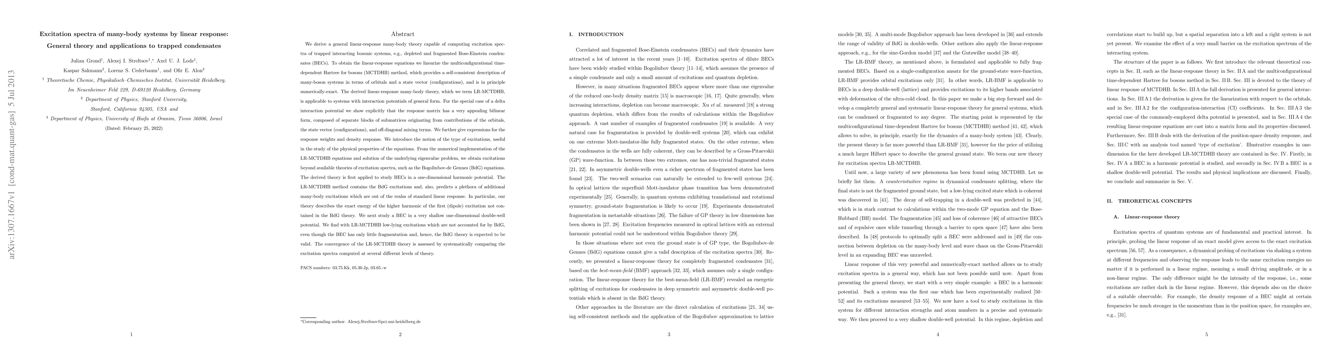 This paper develops a general linear-response many-body theory, termed LR-MCTDHB, to compute excitation spectra for trapped interacting bosonic systems, such as Bose-Einstein condensates. The theory extends beyond the standard Bogoliubov-de Gennes equations by predicting additional many-body excitations, including higher harmonics of dipole excitations.