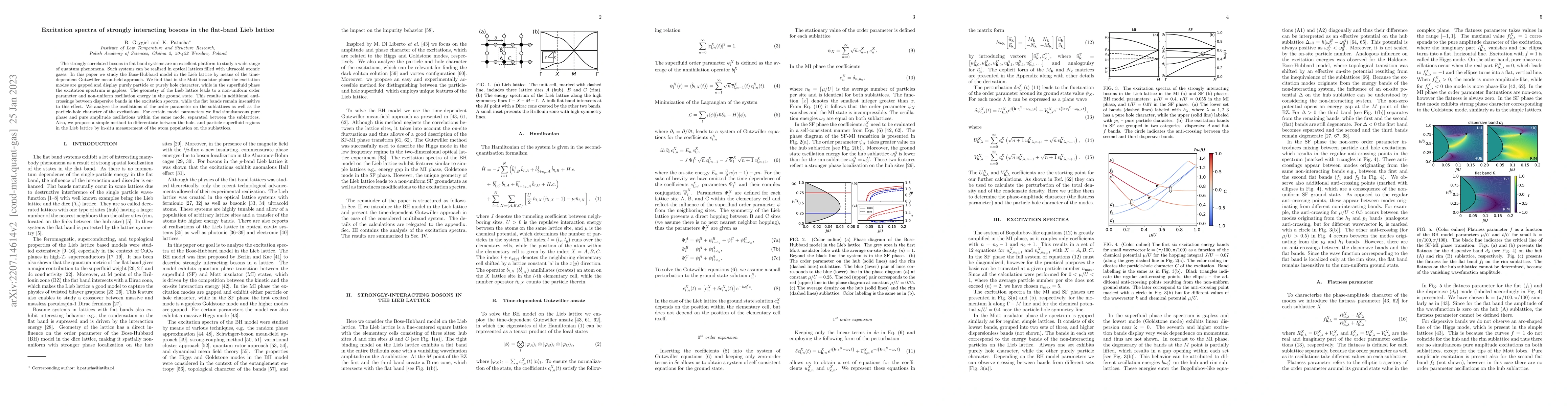 The strongly correlated bosons in flat band systems are an excellent platform to study a wide range of quantum phenomena. Such systems can be realized in optical lattices filled with ultracold atomic gases. In this paper we study the Bose-Hubbard model in the Lieb lattice by means of the time-dependent Gutzwiller mean-field approach. We find that in the Mott insulator phase the excitation modes are gapped and display purely particle or purely hole character, while in the superfluid phase the excitation spectrum is gapless. The geometry of the Lieb lattice leads to a non-uniform order parameter and non-uniform oscillation energy in the ground state. This results in additional anti-crossings between dispersive bands in the excitation spectra, while the flat bands remain insensitive to this effect. We analyze the oscillations of the order parameter on the sublattices as well as the particle-hole character of the excitations. For certain model parameters we find simultaneous pure phase and pure amplitude oscillations within the same mode, separated between the sublattices. Also, we propose a simple method to differentiate between the hole- and particle superfluid regions in the Lieb lattice by in-situ measurement of the atom population on the sublattices.