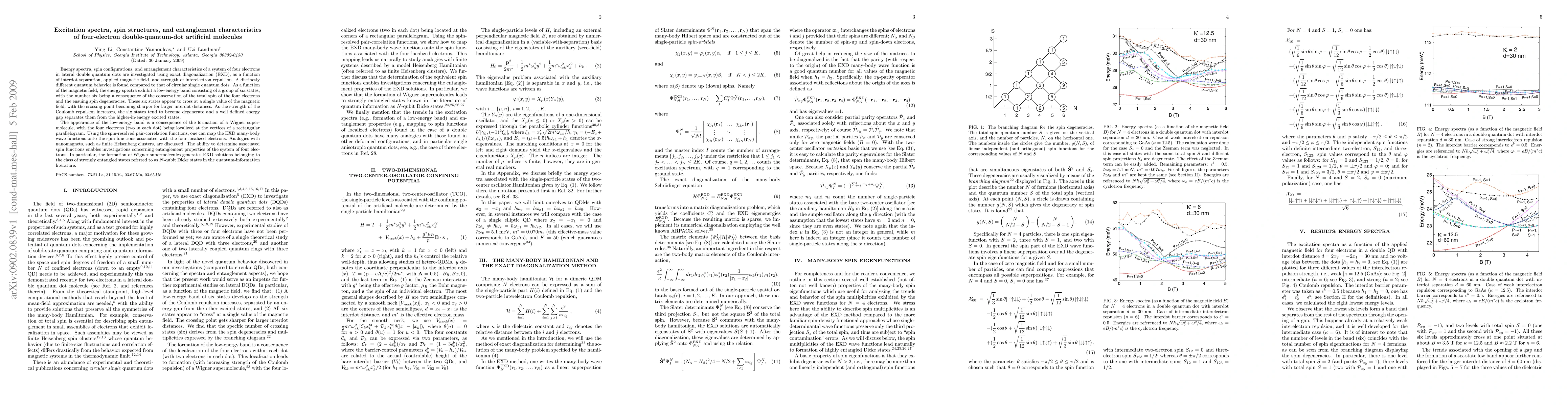 This paper investigates the energy spectra, spin configurations, and entanglement characteristics of four electrons in lateral double quantum dots using exact diagonalization. It finds a low-energy band of six states due to the formation of a Wigner supermolecule, with these states becoming degenerate under increased Coulomb repulsion. The study also reveals the presence of strongly entangled N-qubit Dicke states.