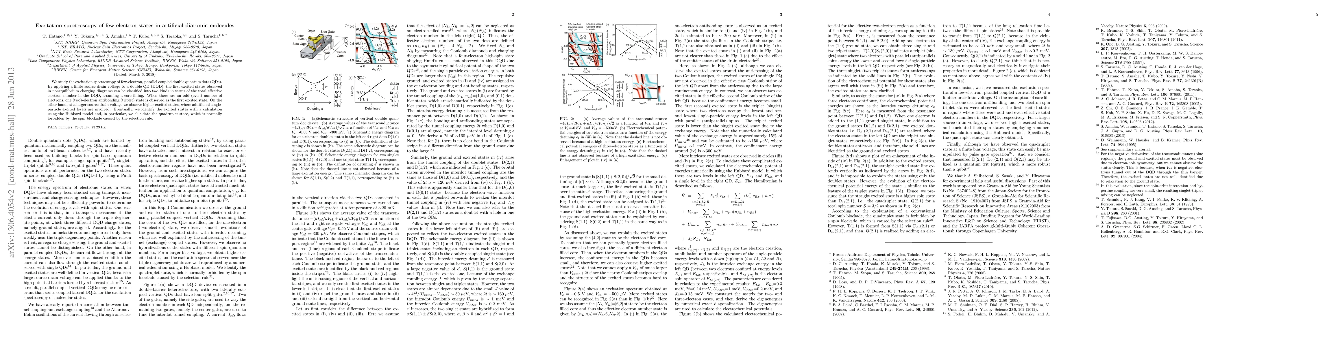 This paper investigates the excitation spectroscopy of few-electron states in artificial diatomic molecules formed by parallel coupled double quantum dots. The study reveals distinct first excited states based on the total electron number, identifying one-electron antibonding states for odd electron counts and two-electron triplet states for even counts, while higher voltages expose additional single-particle excited levels, including a forbidden quadruplet state elucidated via the Hubbard model.