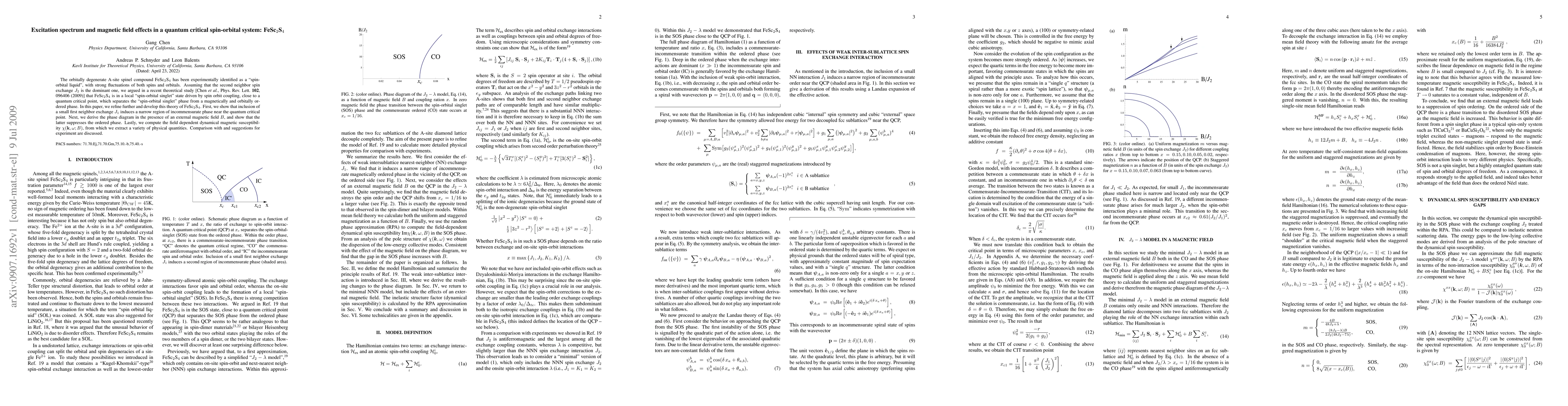 The orbitally degenerate A-site spinel compound FeSc2S4 has been experimentally identified as a ``spin-orbital liquid'', with strong fluctuations of both spins and orbitals. Assuming that the second neighbor spin exchange J2 is the dominant one, we argued in a recent theoretical study [Chen et al., Phys. Rev. Lett. 102, 096406 (2009)] that FeSc2S4 is in a local ``spin-orbital singlet'' state driven by spin orbit coupling, close to a quantum critical point, which separates the ``spin-orbital singlet'' phase from a magnetically and orbitally ordered phase. In this paper, we refine further and develop this theory of FeSc2S4 . First, we show that inclusion of a small first neighbor exchange J1 induces a narrow region of incommensurate phase near the quantum critical point. Next, we derive the phase diagram in the presence of an external magnetic field B, and show that the latter suppresses the ordered phase. Lastly, we compute the field dependent dynamical magnetic susceptibility $\chi(k, \omega; B)$, from which we extract a variety of physical quantities. Comparison with and suggestions for experiment are discussed.