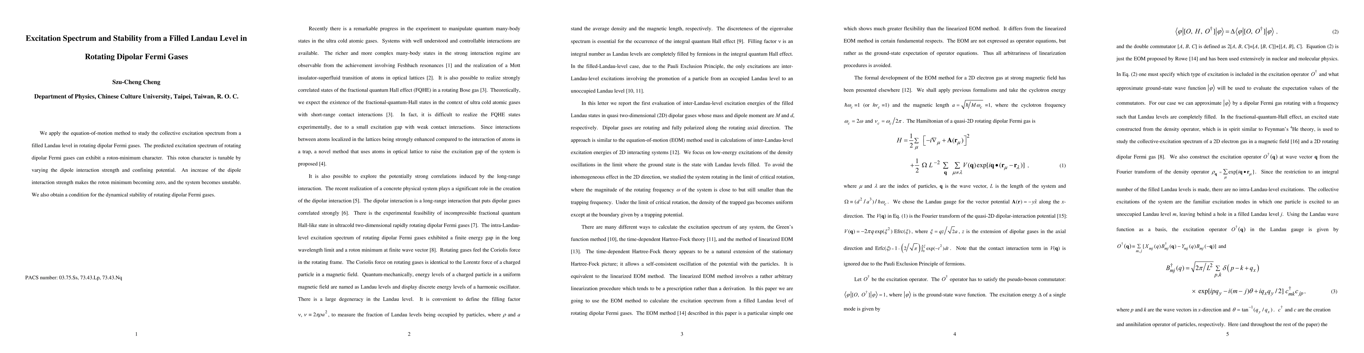We apply the equation-of-motion method to study the collective excitation spectrum from a filled Landau level in rotating dipolar Fermi gases. The predicted excitation spectrum of rotating dipolar Fermi gases can exhibit a roton-minimum character. This roton character is tunable by varying the dipole interaction strength and confining potential. An increase of the dipole interaction strength makes the roton minimum becoming zero, and the system becomes unstable. We also obtain a condition for the dynamical stability of rotating dipolar Fermi gases.