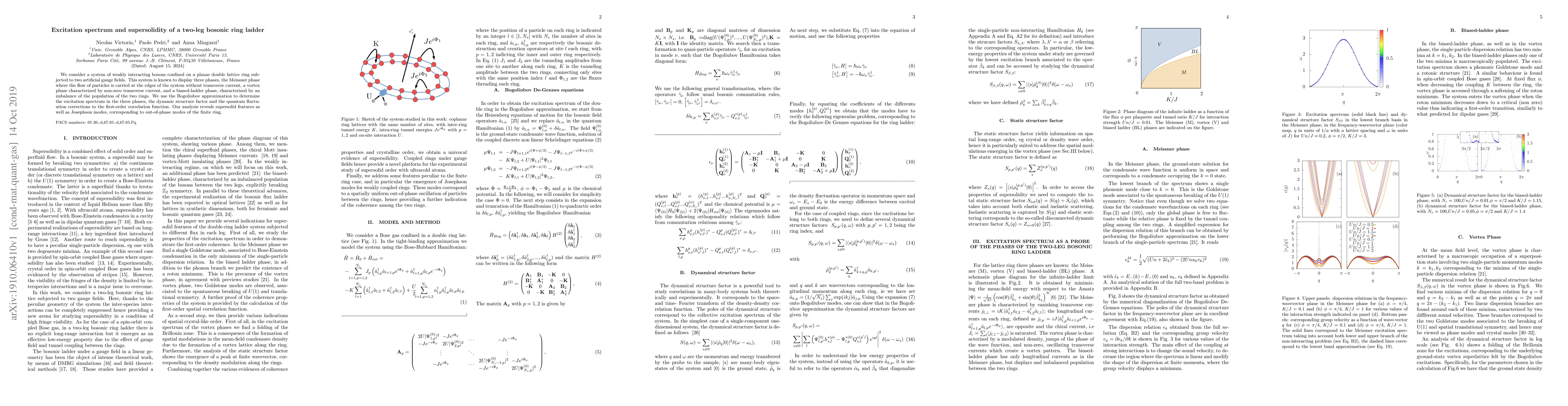 We consider a system of weakly interacting bosons confined on a planar double lattice ring subjected to two artificial gauge fields. This system is known to display three phases, the Meissner phase where the flow of particles is carried at the edges of the system without transverse current, a vortex phase characterized by non-zero transverse current, and a biased-ladder phase, characterized by an imbalance of the population of the two rings. We use the Bogoliubov approximation to determine the excitation spectrum in the three phases, the dynamic structure factor and the quantum fluctuation corrections to the first-order correlation function. Our analysis reveals supersolid features as well as Josephson modes, corresponding to out-of-phase modes of the finite ring.