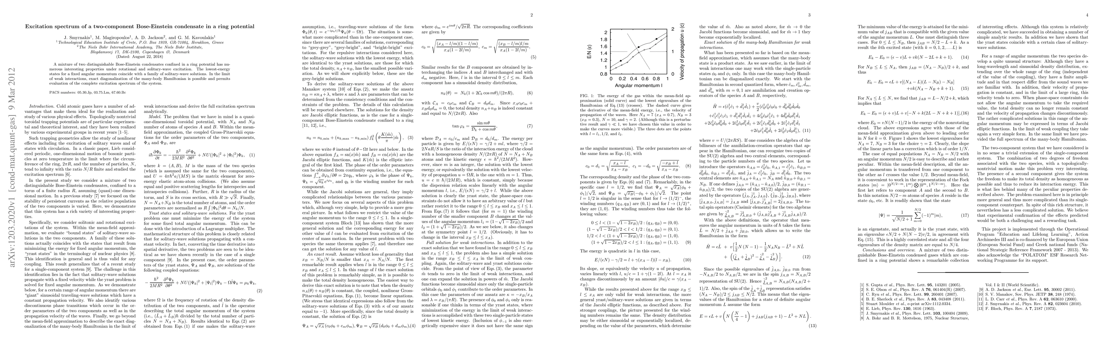This paper explores the excitation spectrum of a two-component Bose-Einstein condensate in a ring potential, revealing solitary-wave solutions and evaluating the complete excitation spectrum through exact diagonalization in the weak interaction limit. The study highlights interesting properties under rotational and solitary-wave excitations.