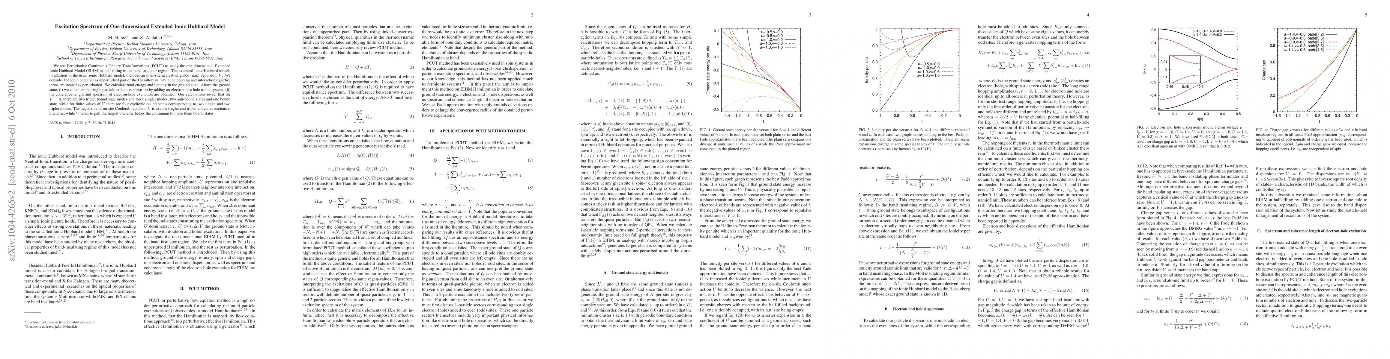 We use Perturbative Continuous Unitary Transformations (PCUT) to study the one dimensional Extended Ionic Hubbard Model (EIHM) at half-filling in the band insulator region. The extended ionic Hubbard model, in addition to the usual ionic Hubbard model, includes an inter-site nearest-neighbor (n.n.) repulsion, $V$. We consider the ionic potential as unperturbed part of the Hamiltonian, while the hopping and interaction (quartic) terms are treated as perturbation. We calculate total energy and ionicity in the ground state. Above the ground state, (i) we calculate the single particle excitation spectrum by adding an electron or a hole to the system. (ii) the coherence-length and spectrum of electron-hole excitation are obtained. Our calculations reveal that for V=0, there are two triplet bound state modes and three singlet modes, two anti-bound states and one bound state, while for finite values of $V$ there are four excitonic bound states corresponding to two singlet and two triplet modes. The major role of on-site Coulomb repulsion $U$ is to split singlet and triplet collective excitation branches, while $V$ tends to pull the singlet branches below the continuum to make them bound states.
